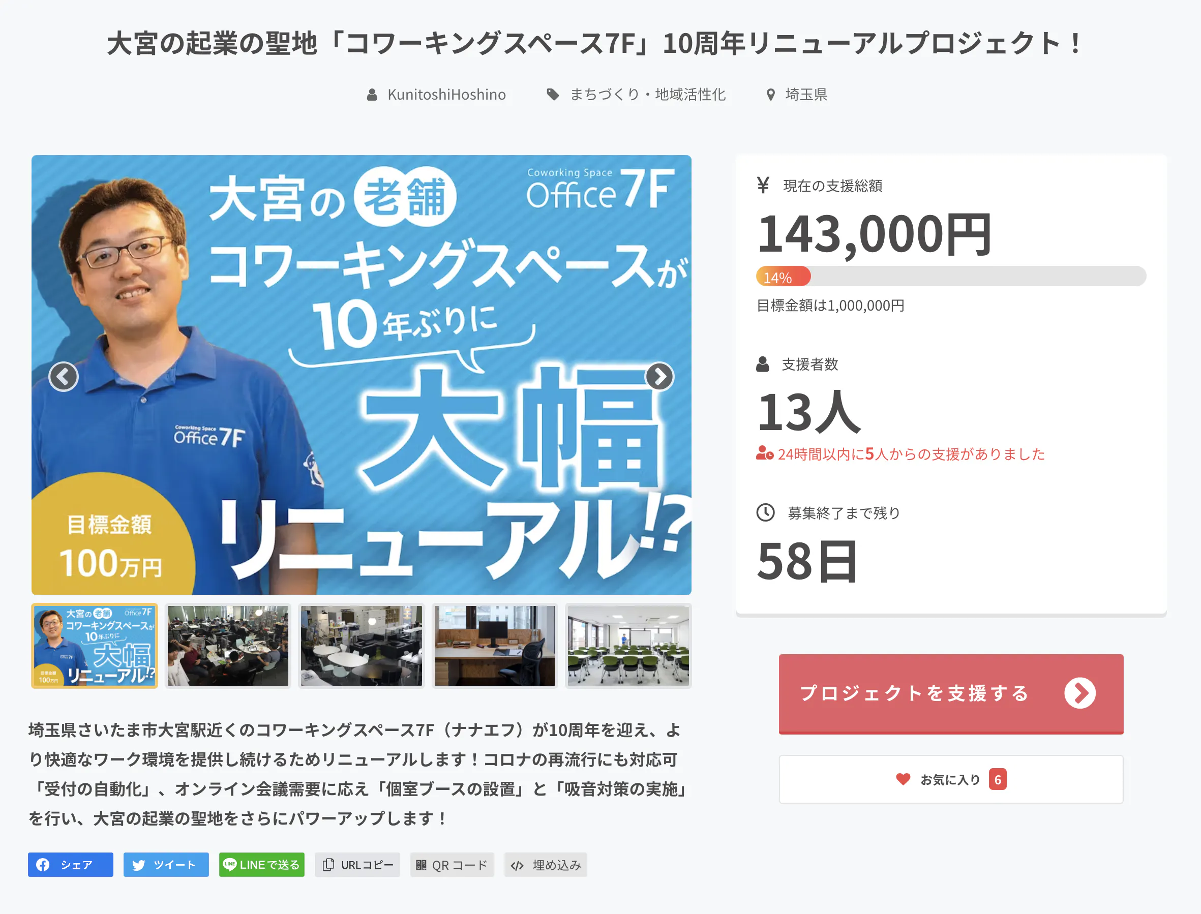 プロジェクトを開始した1日半くらいの時間で、13人の支援者様から、143,000円のご支援をいただきました。