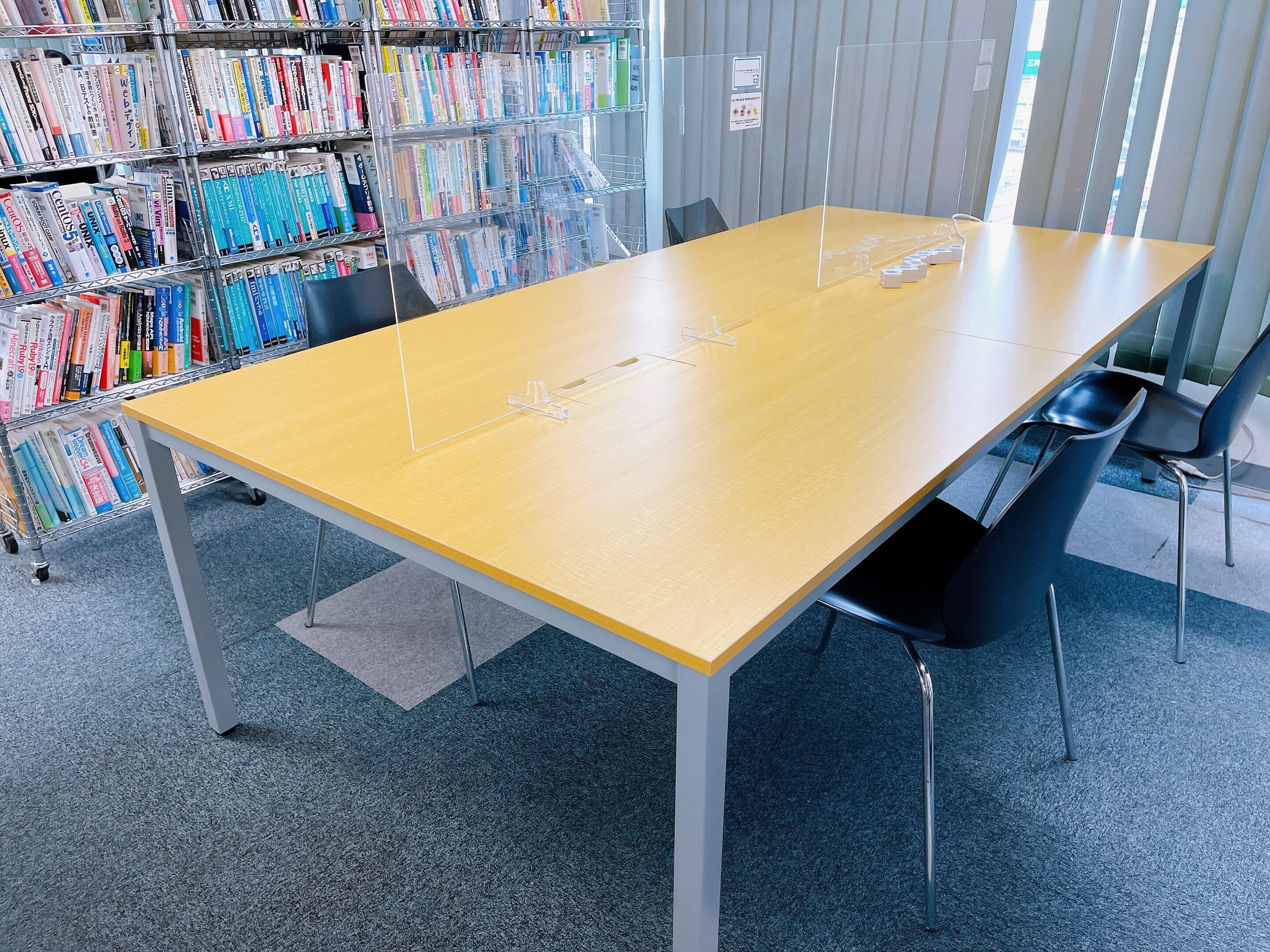 最近では、コワーキングスペース7F(ナナエフ)の席の中でも人気のスペース、「ミーティングスペース・本棚裏」の机を新調しました。