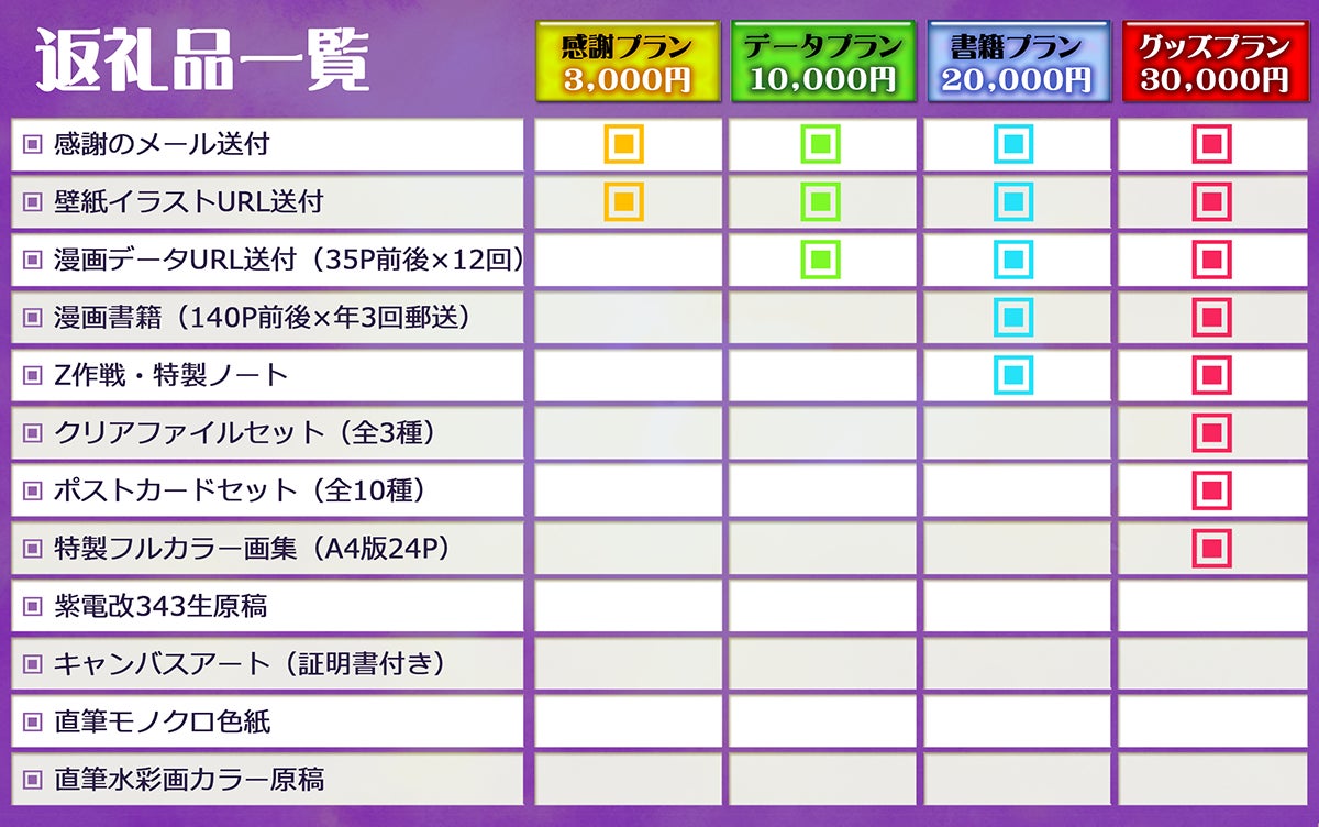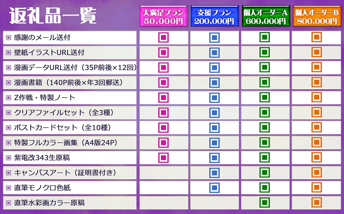 A8:サイトの仕様上、支援後のキャンセルやプランの変更はできません、よくご検討の上でのご購入をお勧め致します。また支援金に金額を上乗せをすることによるアップデートも不可となっております。(例:3,000円コースに7,000円を上乗せ支援しても受け取れるのは3,000円コースのリターンです。)(例2:3,000円コースを購入後、後日2,000円を支援しても5,000円コースの内容にはできません。)