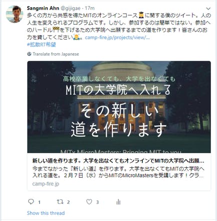 1万を超える人から共感を得て、これは凄い、と考えても、すぐ忘れてしまうのが、また人間です。今回のプログラムによって、人生そのものが変わる人もいます。また、このような選択肢があることを知っていれば人生の計画も変わるかもしれません。MITが実施する今回の試み、本当に大事なことだと考えてます。このまま忘れてしまわないようにプロジェクトを支援し、進捗状況を確認、そしていつかはご自分でもプログラムに参加してみてください。。