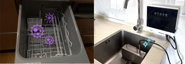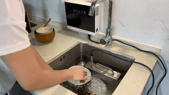 複雑な工事が一切不要!狭いキッチンコーナーでもつけ置くだけで、最短30秒洗浄完了です。