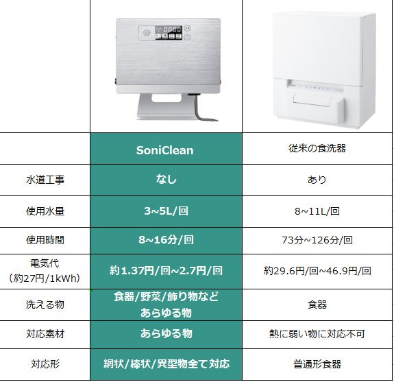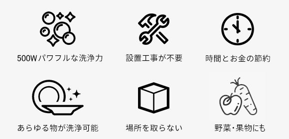 従来の家庭用食洗機に比べ、複雑な工事が一切不要、狭いキッチンコーナーでも設置可能、