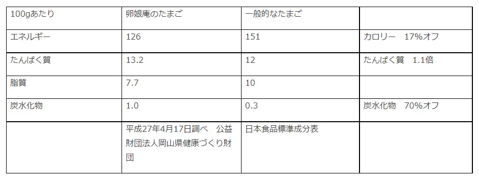 カロリー17%オフで脂質が低いですが、タンパク質が高く健康維持にとてもよい食材だと思います。健康で走り回っている筋肉がついた鶏たちが生んだ卵はとってもヘルシーです。