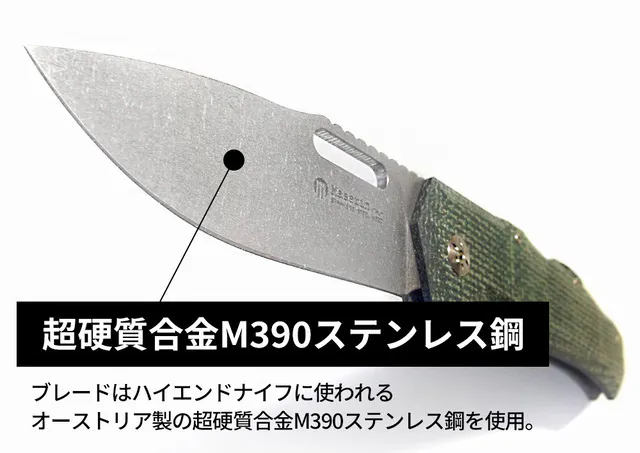 【Maserin Nimrod】のブレードはハイエンドナイフに使われるオーストリア製の超硬質合金M390ステンレス鋼を使用しています。
