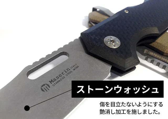 また、木などを削った時にブレードに付いた傷が目立たないように、ブレードにはストーンウォッシュの艶消し加工を施しました。