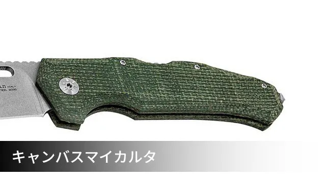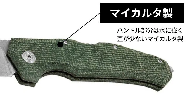 しかし超硬質鋼のM390を使っているため刃が薄く、ハンドル部分は丈夫なカーボンや天然繊維といったシートを積層構造で重ね、フェノール樹脂で固めたマイカルタを使用しているため、重さはわずか122gと非常に軽量です。
