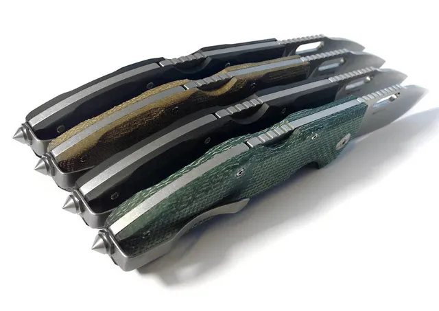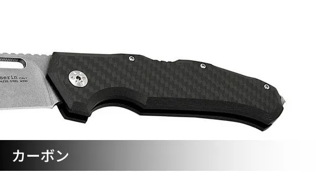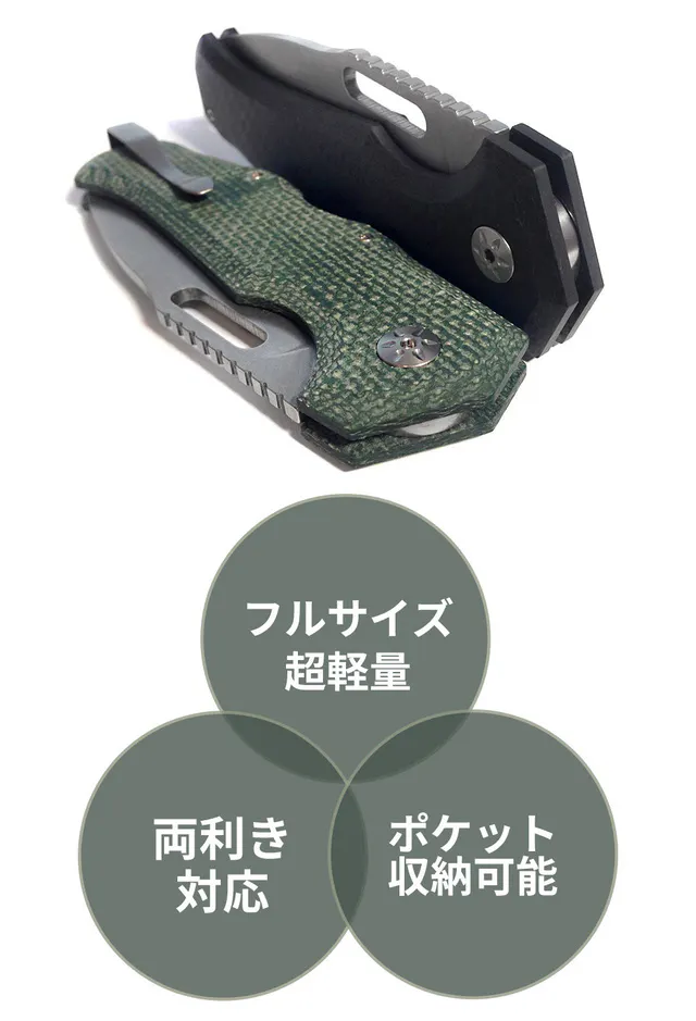 このナイフは軽量で、人間工学的にも優れています。ハンドルはG10に加え、マイカルタのグリーンとデザートの新色、そしてより軽量なカーボンファイバーを採用しました。