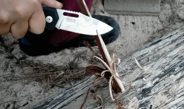 また焚火の火起こしで使うフェザースティクやチップも、タフな【Maserin Nimrod】なら木の枝から楽々削り出せます。