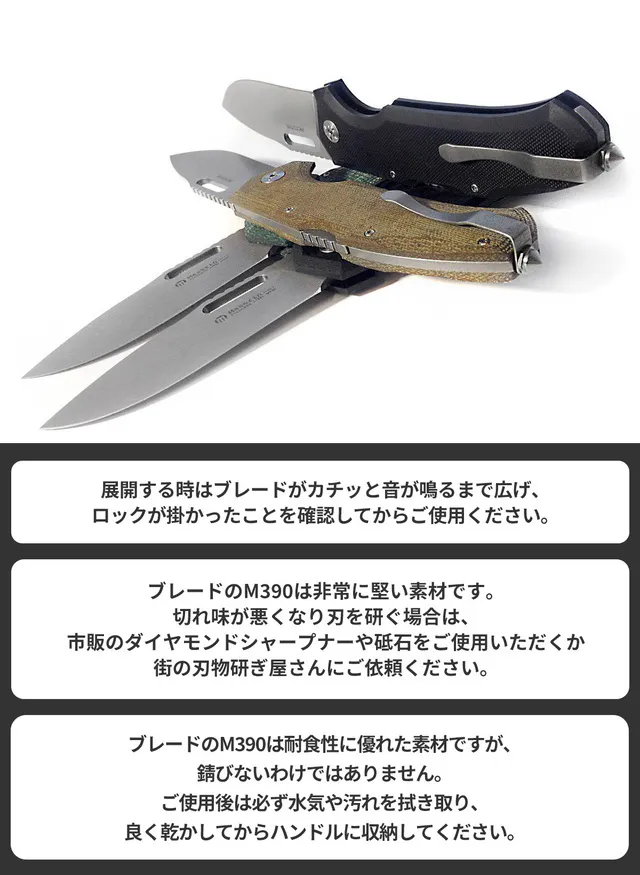 しかしM390鋼はナイフのブレード素材としても非常にバランスが良く、刃の「粘り強さ」を示す靭性(じんせい)も鋼と同等。
