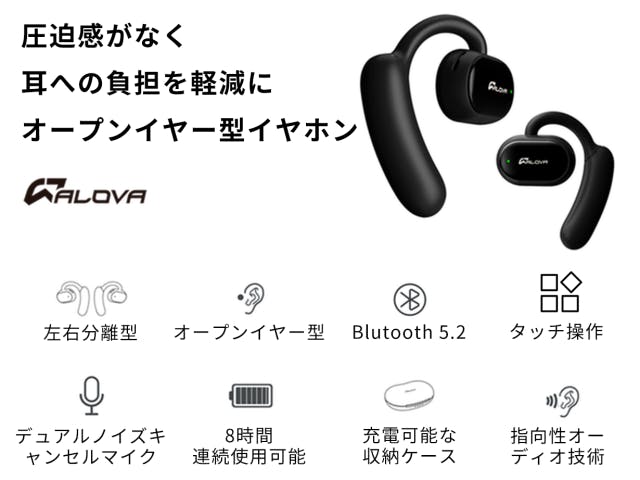 オープンイヤー型TWSイヤホン「ALOVA(アロバ)」とは、ケーブルなし、耳を塞がずに音楽を楽しむことができる左右分離型ワイヤレスイヤホンです。