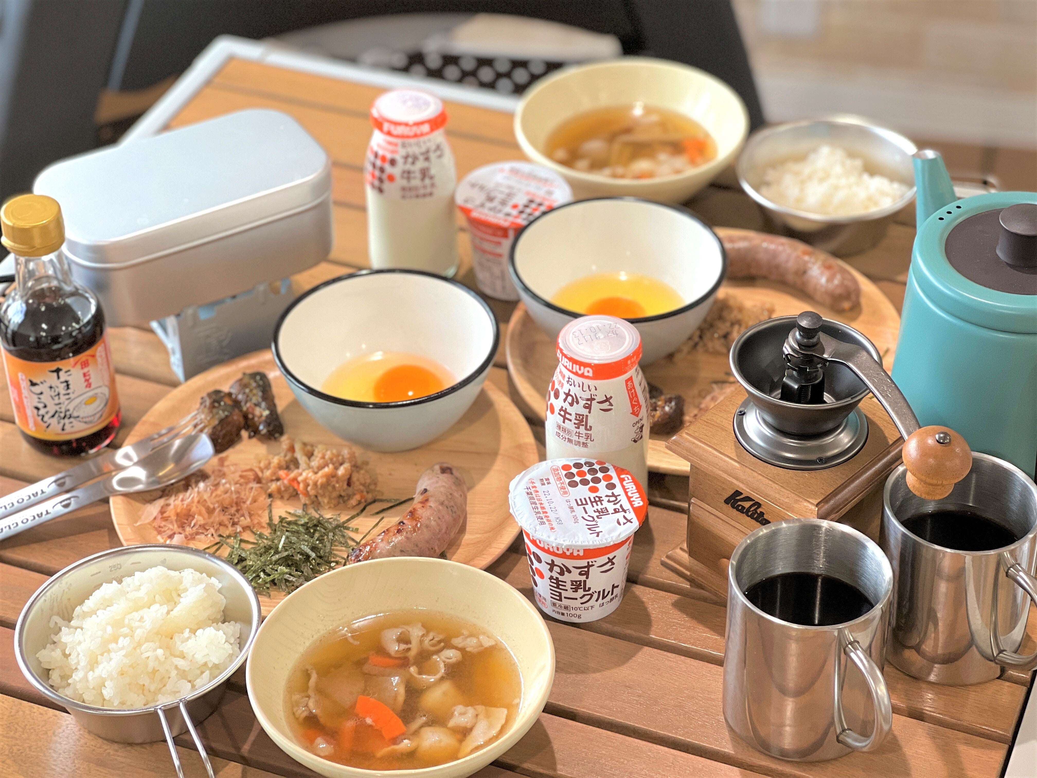 卵かけご飯、鶏そぼろ、ごはんのお供3種、元気豚フランクフルト、豚汁、かずさ牛乳、かずさヨーグルト、コーヒーセット、各種調味料など