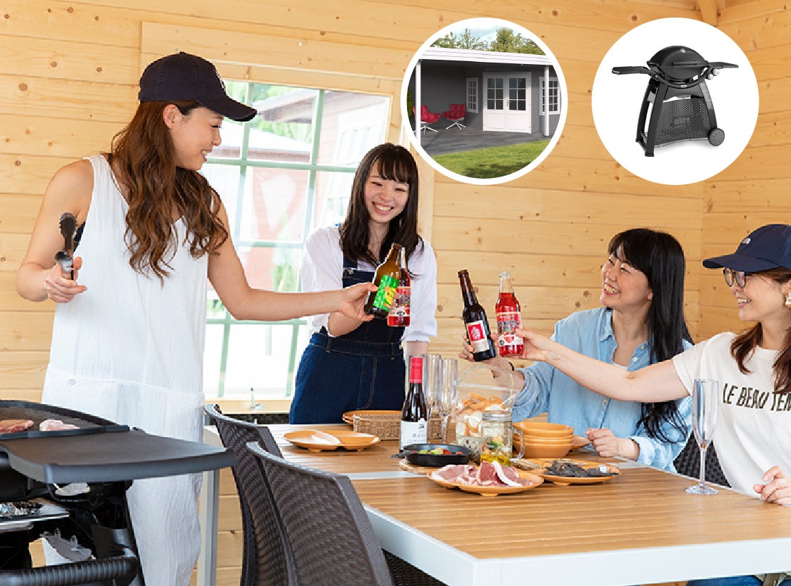 BBQハウスは各テントに併設!北ヨーロッパ製の本格ログハウスで!お食事は各宿泊テントに隣接したBBQハウスでお楽しみいただけます。今回、より広いスペースで本格的なBBQ体験をしていただければと思い、ログハウスは北ヨーロッパのエストニアから直接輸入しています。