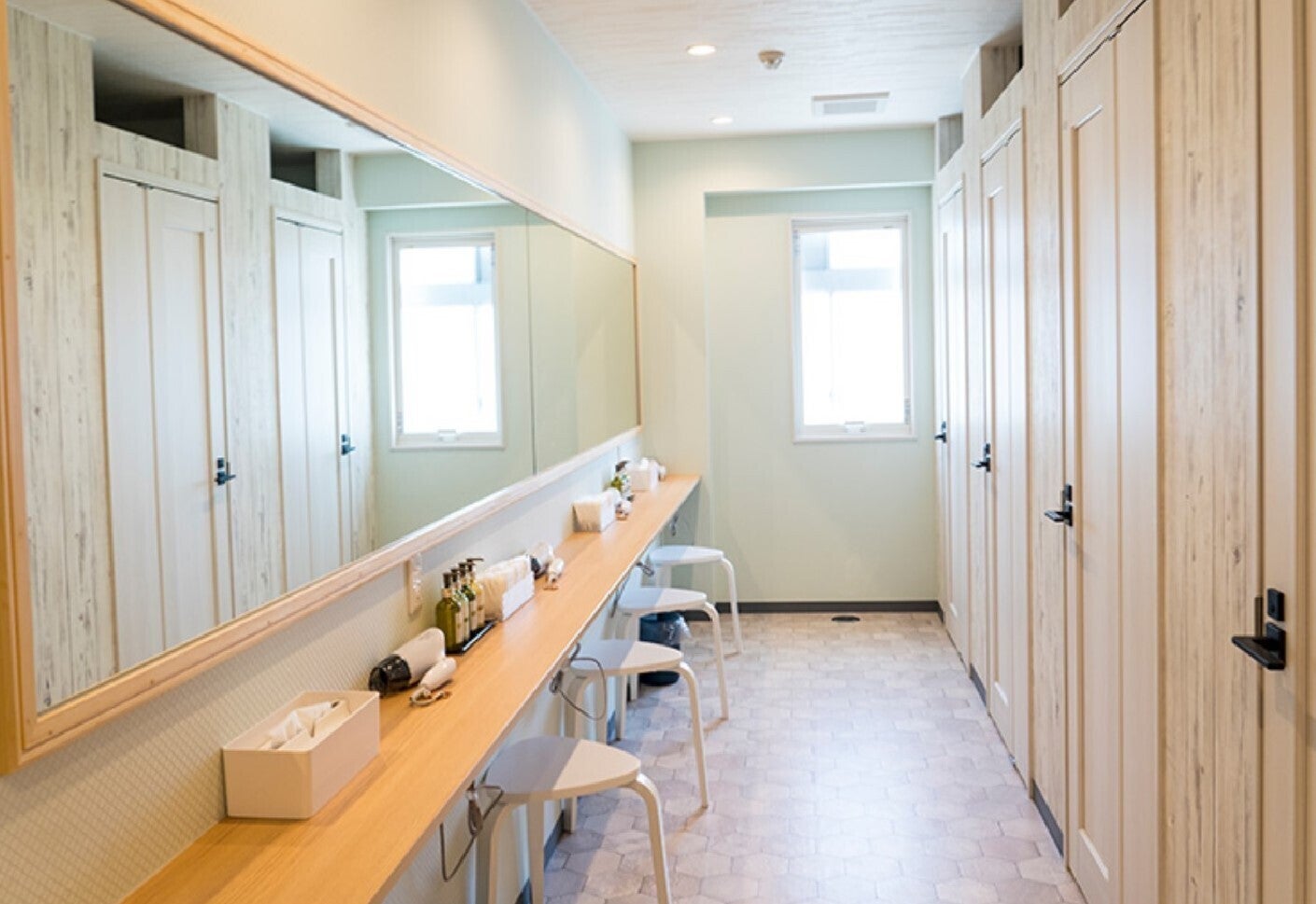 6.【シャワールーム】洗面台には嬉しいアメニティが勢ぞろい!無料の個室シャワー室も準備しております。