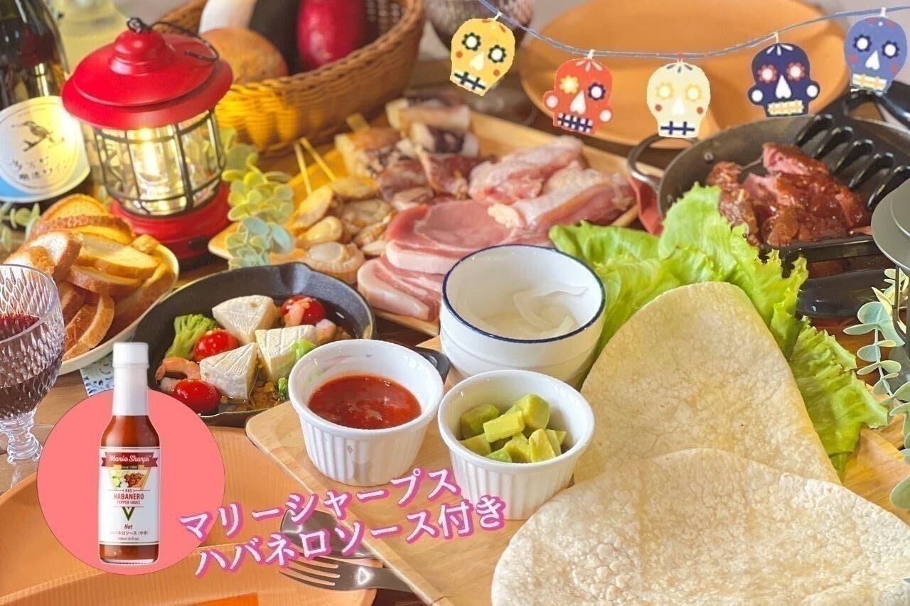 元気豚肩ロース、タコス、プルドポーク、チキンステーキ、海鮮串2種(イカ、ホタテ)、季節の焼き野菜、カマンベールアヒージョ、ラスクパン、各種調味料など