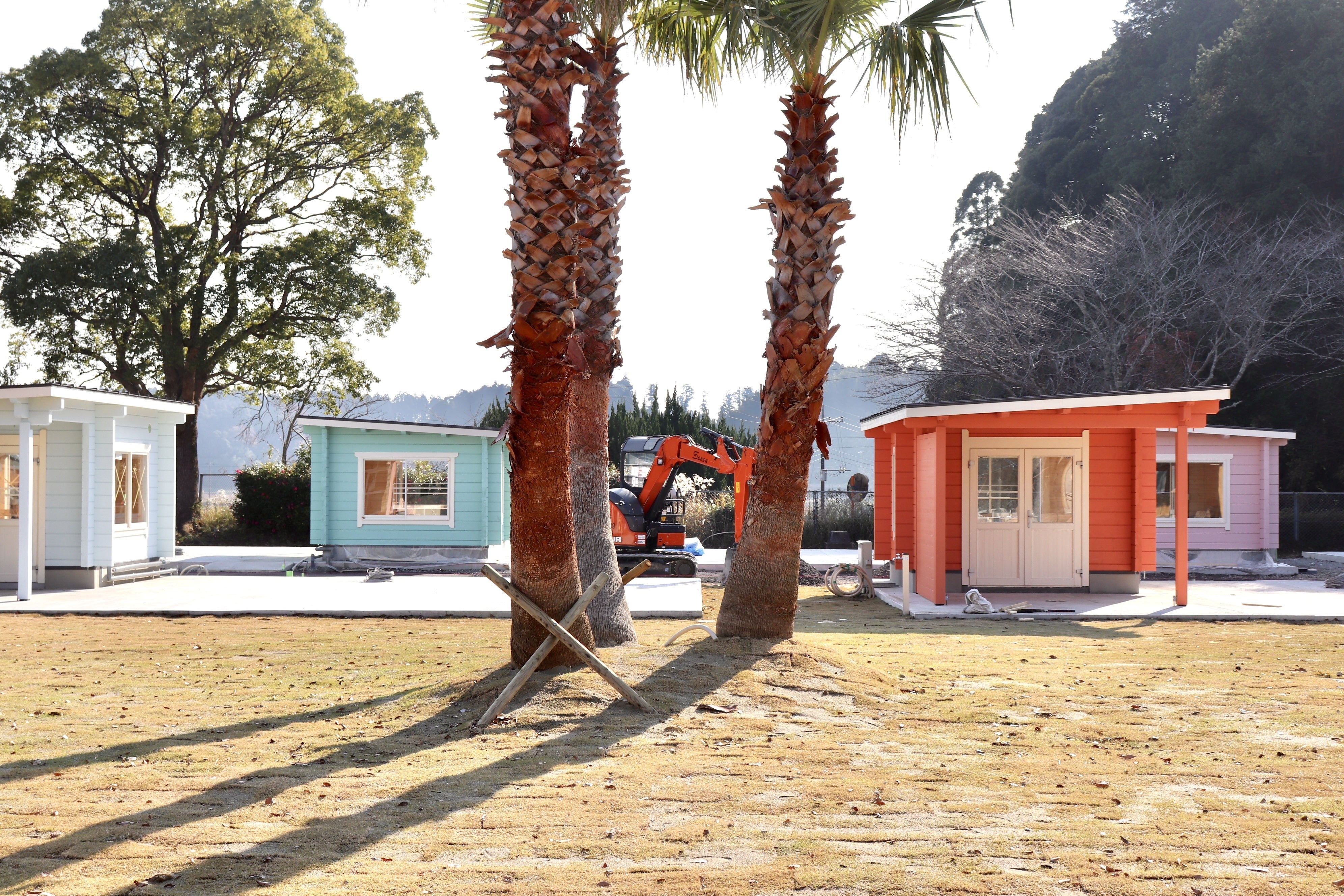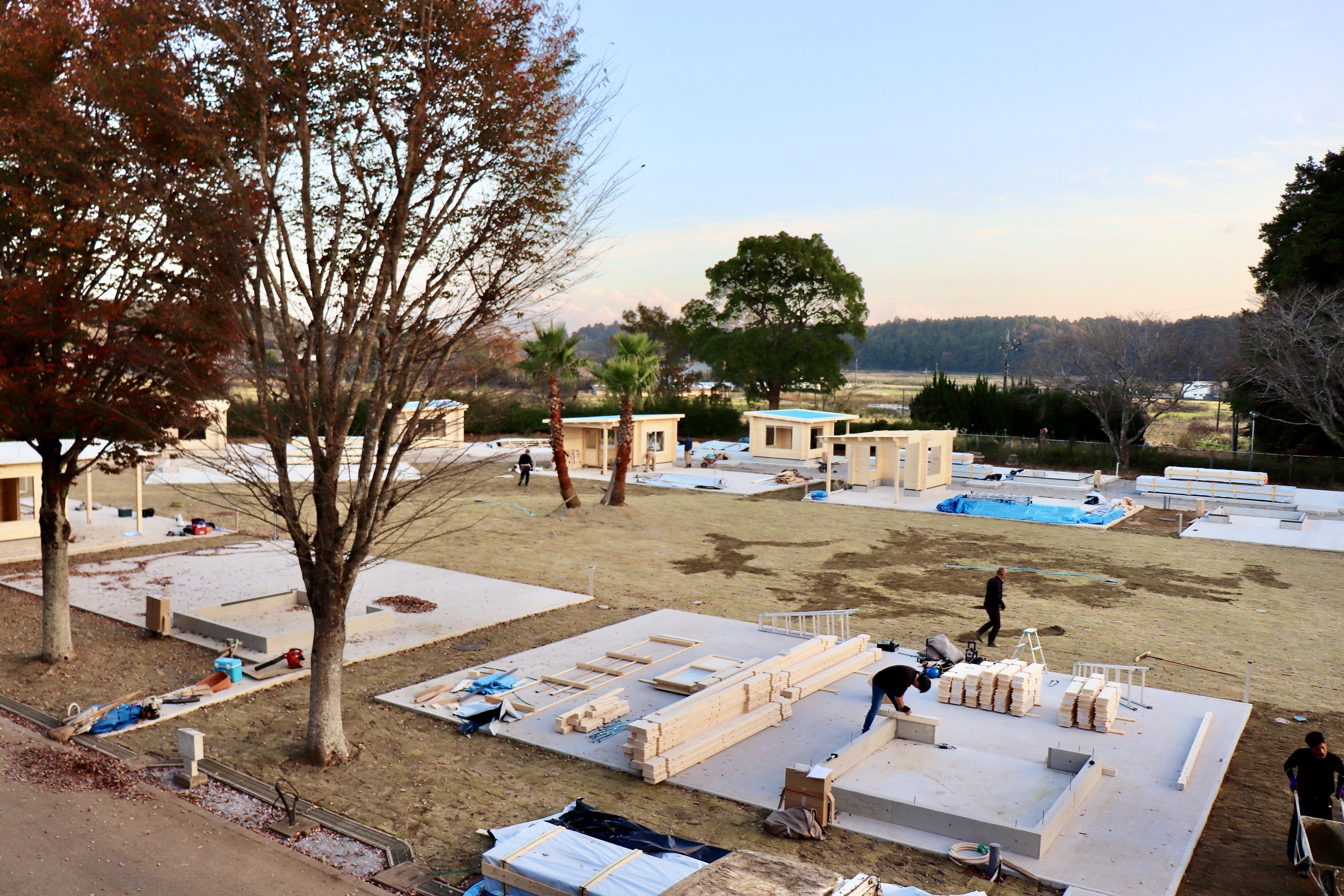 手前に見えるレンガ造りはキャンプファイヤーになる場所で、奥に建ち並び始めているのがBBQハウスです。