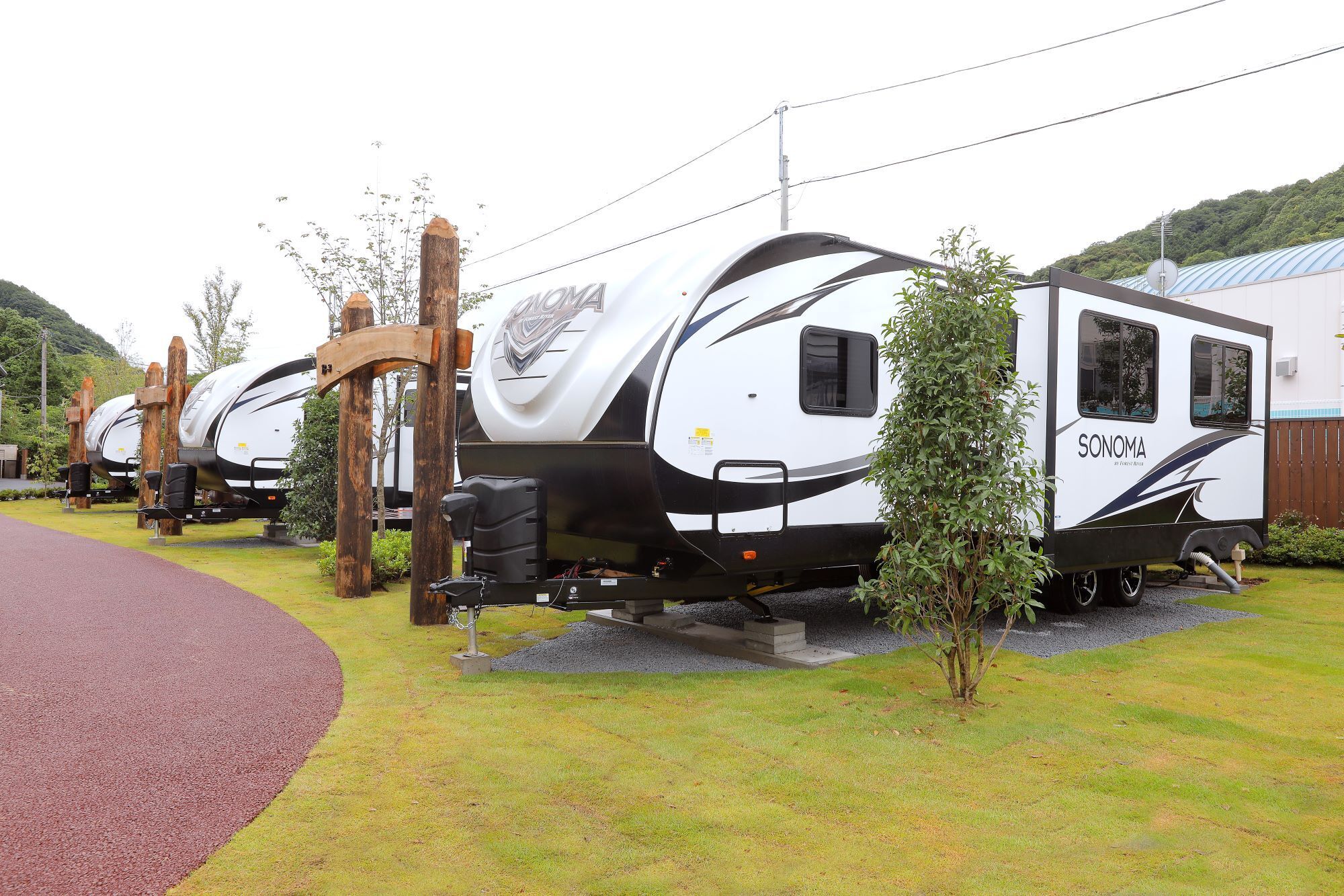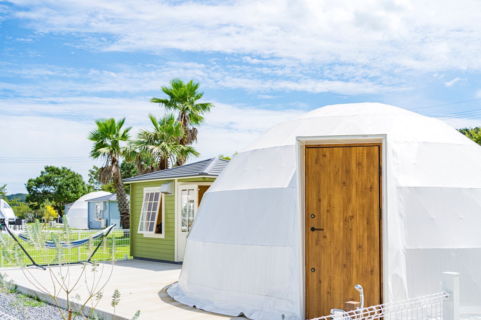 BBQハウスが建っていますが、その横には、ドーム型テント、もしくはトレーラーハウスが並びます。