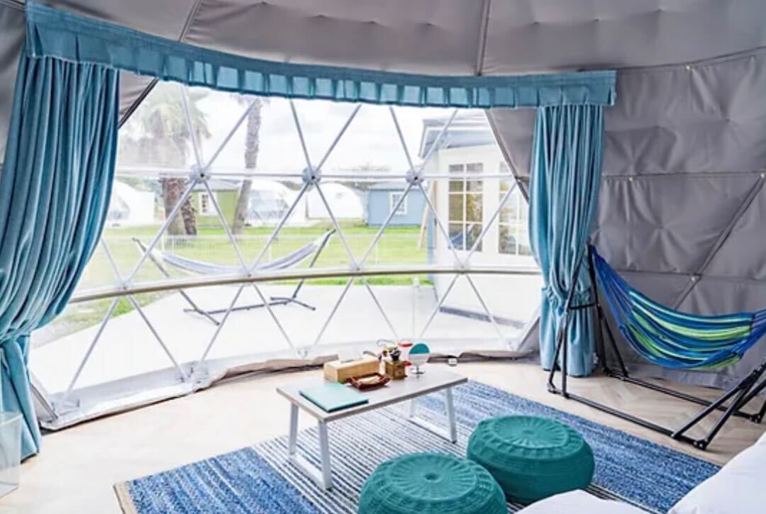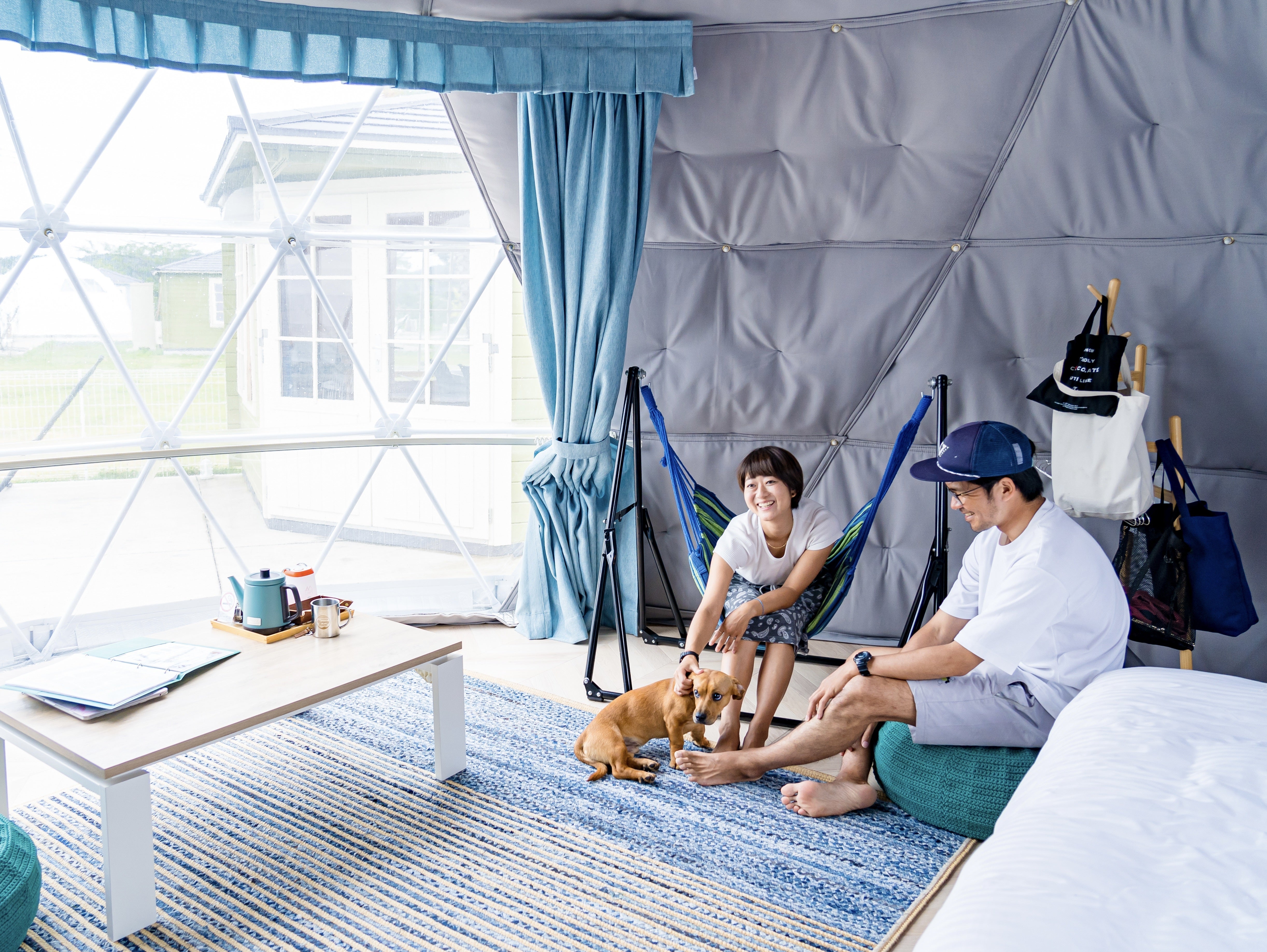 ドームテントは、まるで雪のかまくらの中にいるみたいな作りで、ダイナミックな大きな窓からは多古の自然を間近に感じることができ、グランピングならではの非日常感を味わえます。