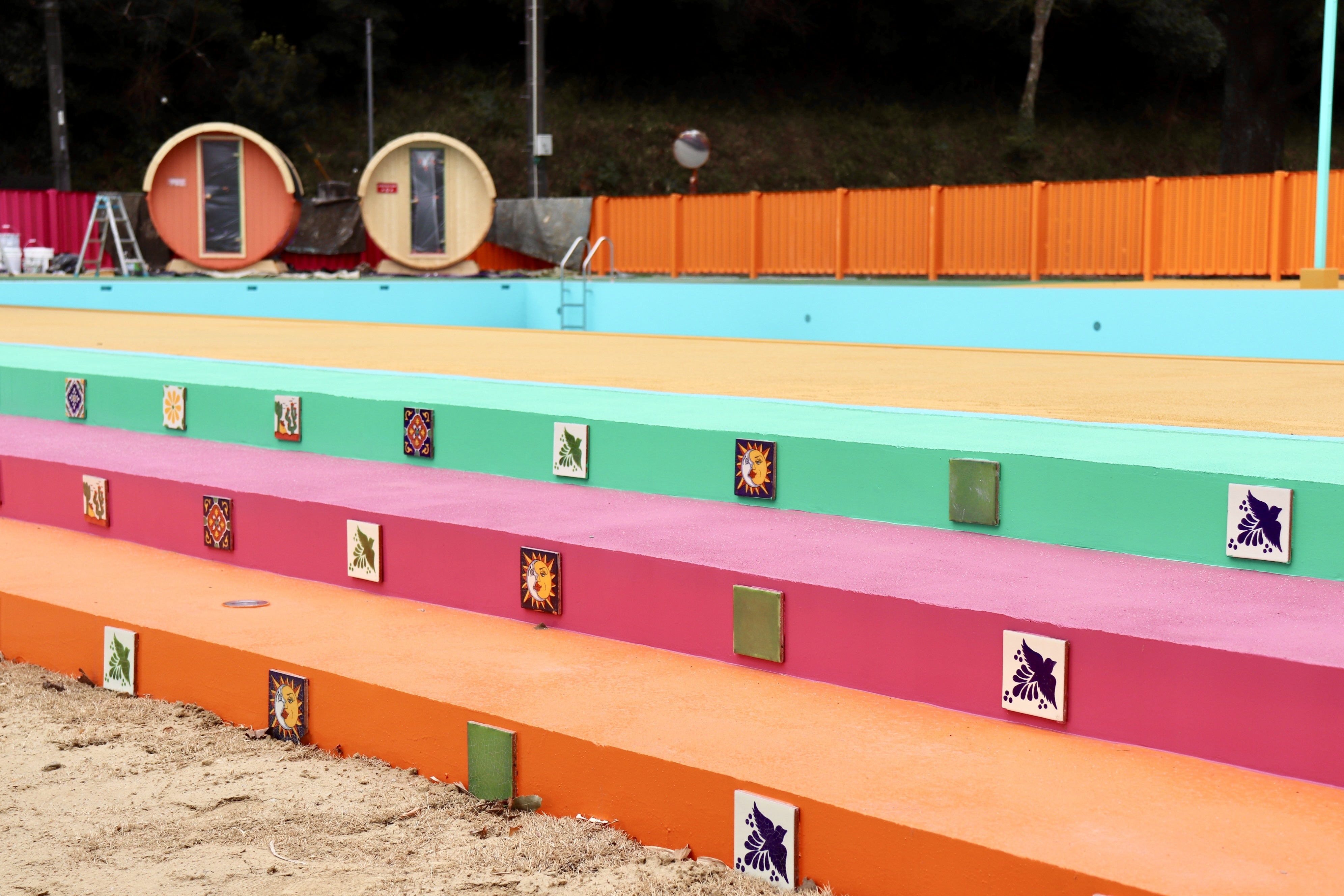 プールへの階段にはメキシコタイルでアクセントを。