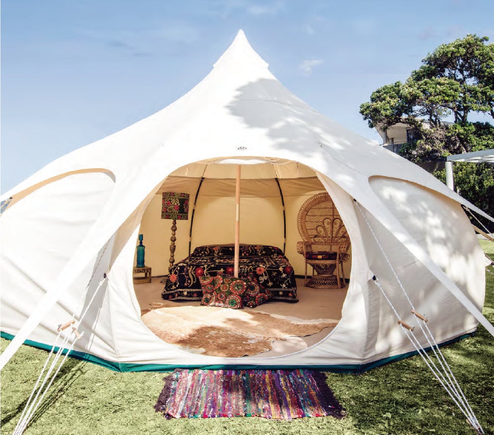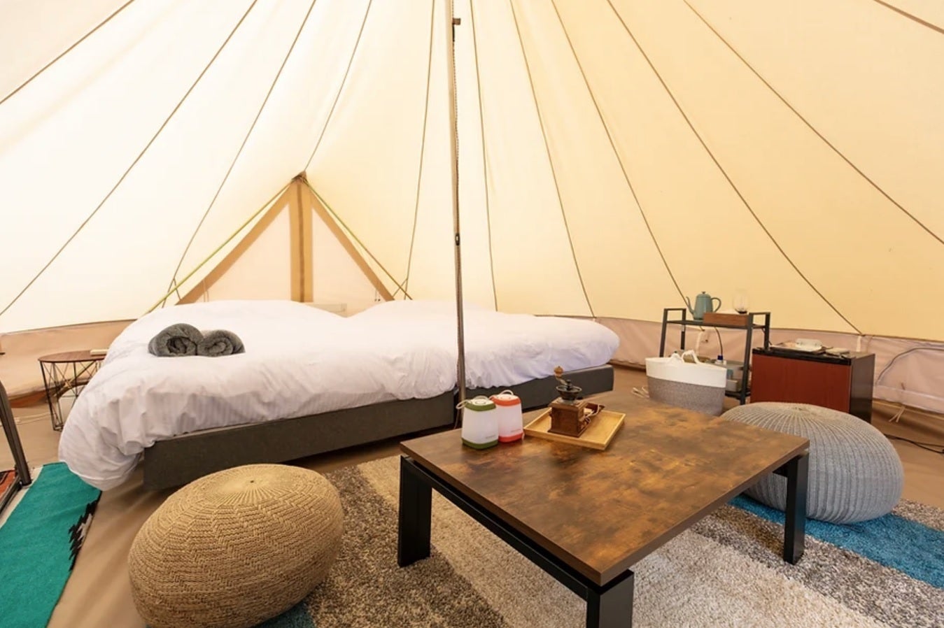 カルパテントは、コロンと可愛い民族テントです。玉ねぎのようなかわいらしい形をしたコットン生地を使っています。一見、壁が薄そうに見えますが、冬キャンプにも対応できるほどの暖房性能です。テント内はもちろん冷暖房も完備。快適なリゾート空間が楽しめます。