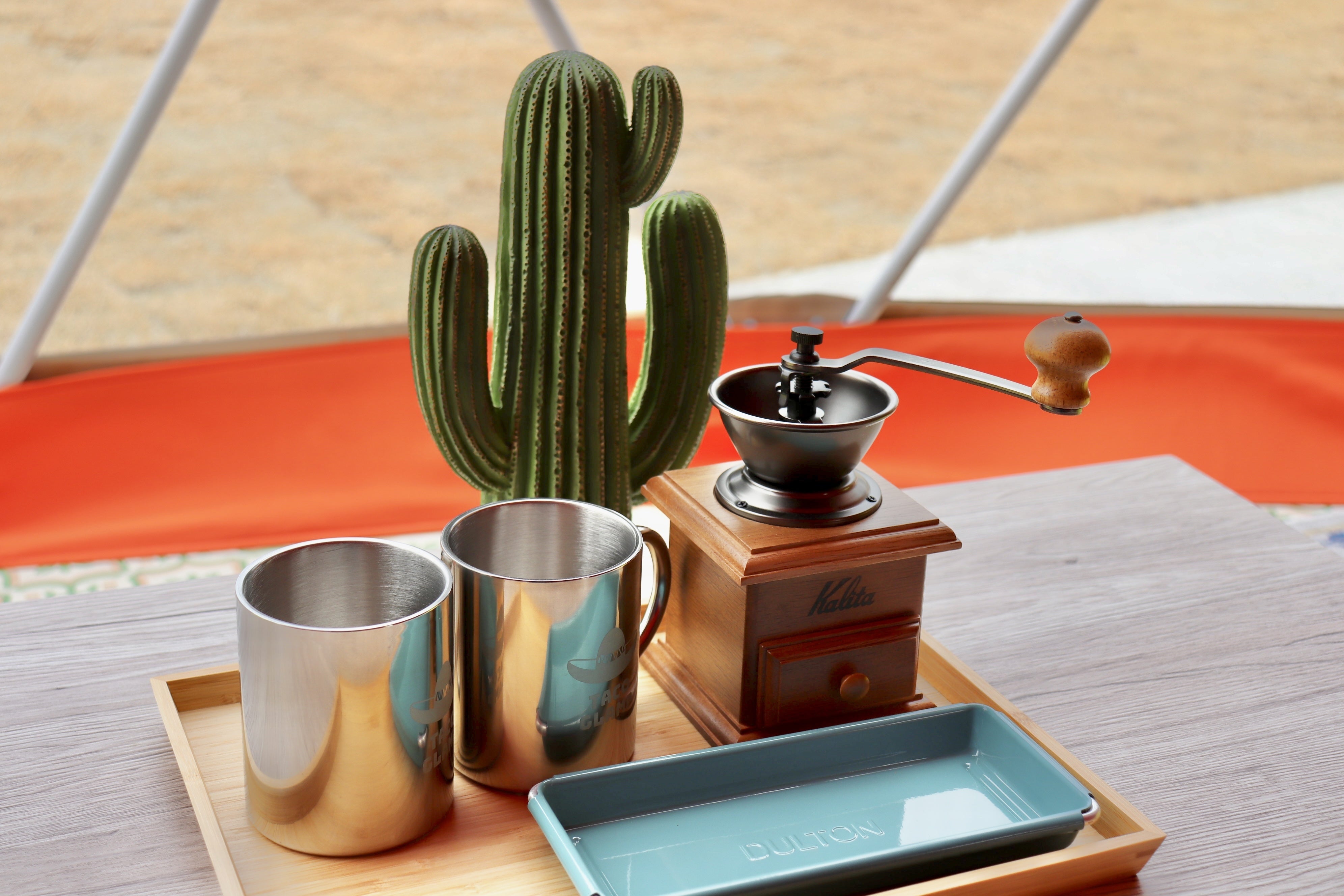 メキシコらしいサボテンの置物と共にあるのは、自分でコーヒーが挽けるコーヒーミルセット。