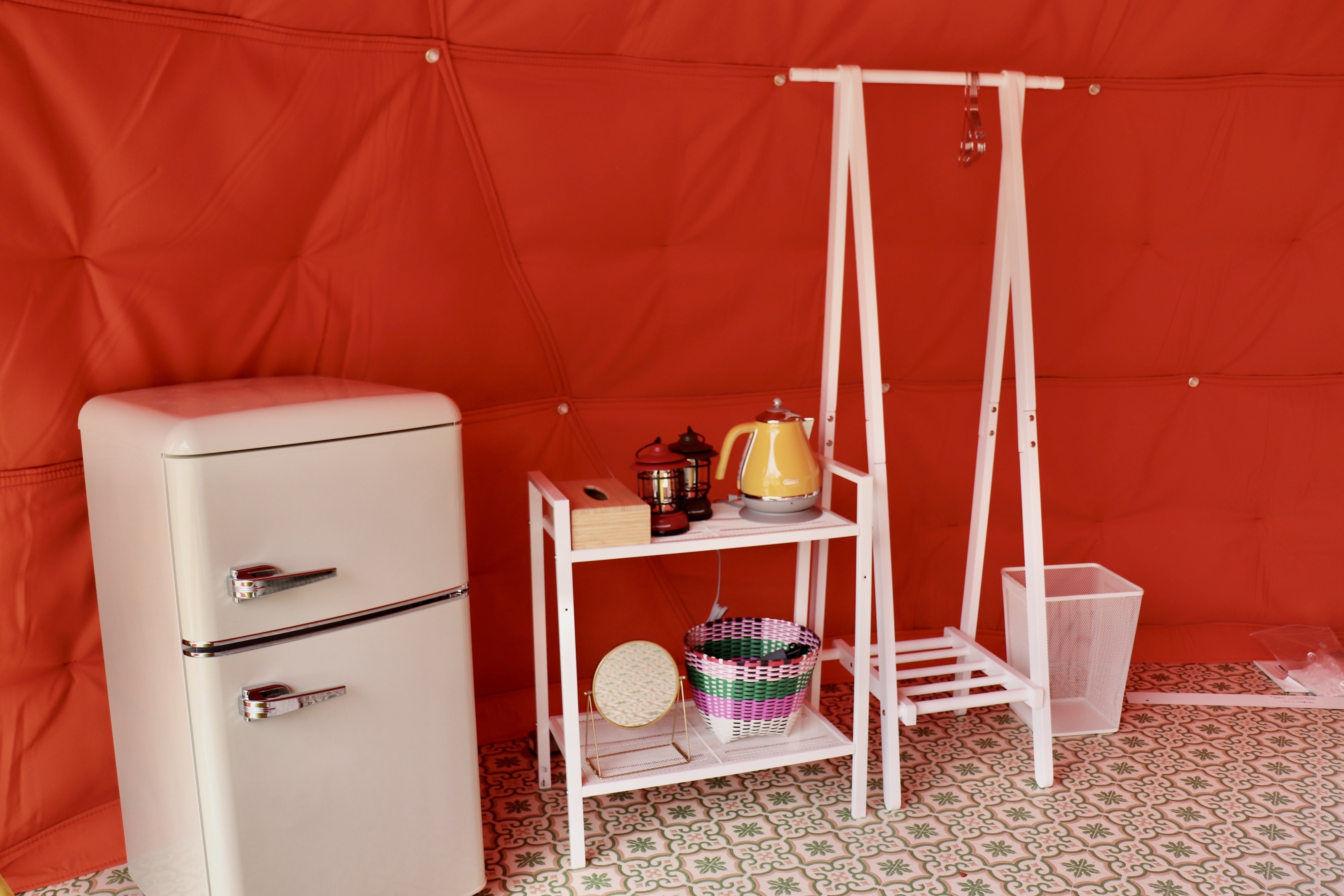 ハンガーラックや電気ケトルやLEDライトに冷蔵庫と、テント内設備やアメニティは揃っています。
