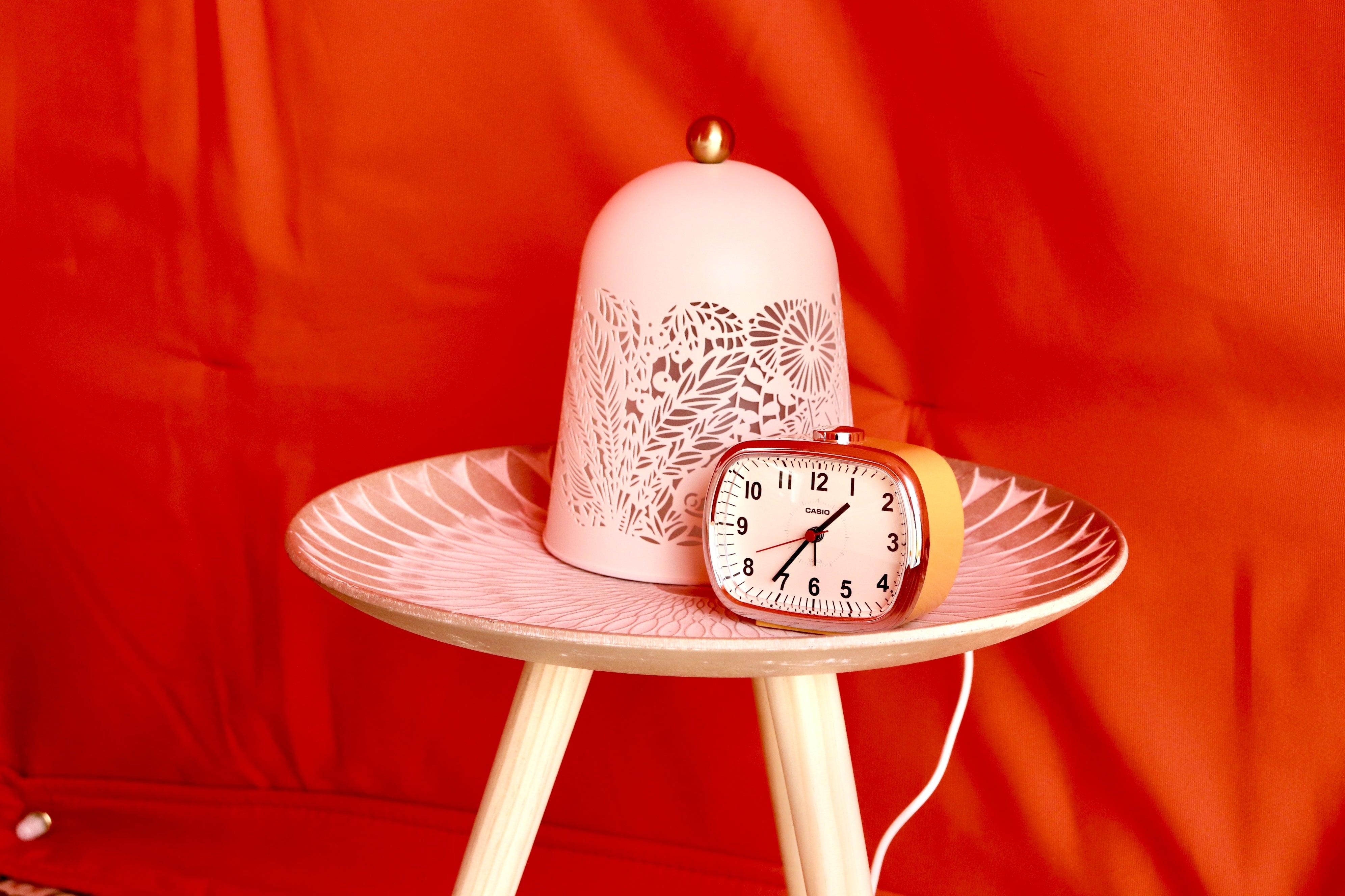 可愛いサイドテーブルにオレンジの時計。