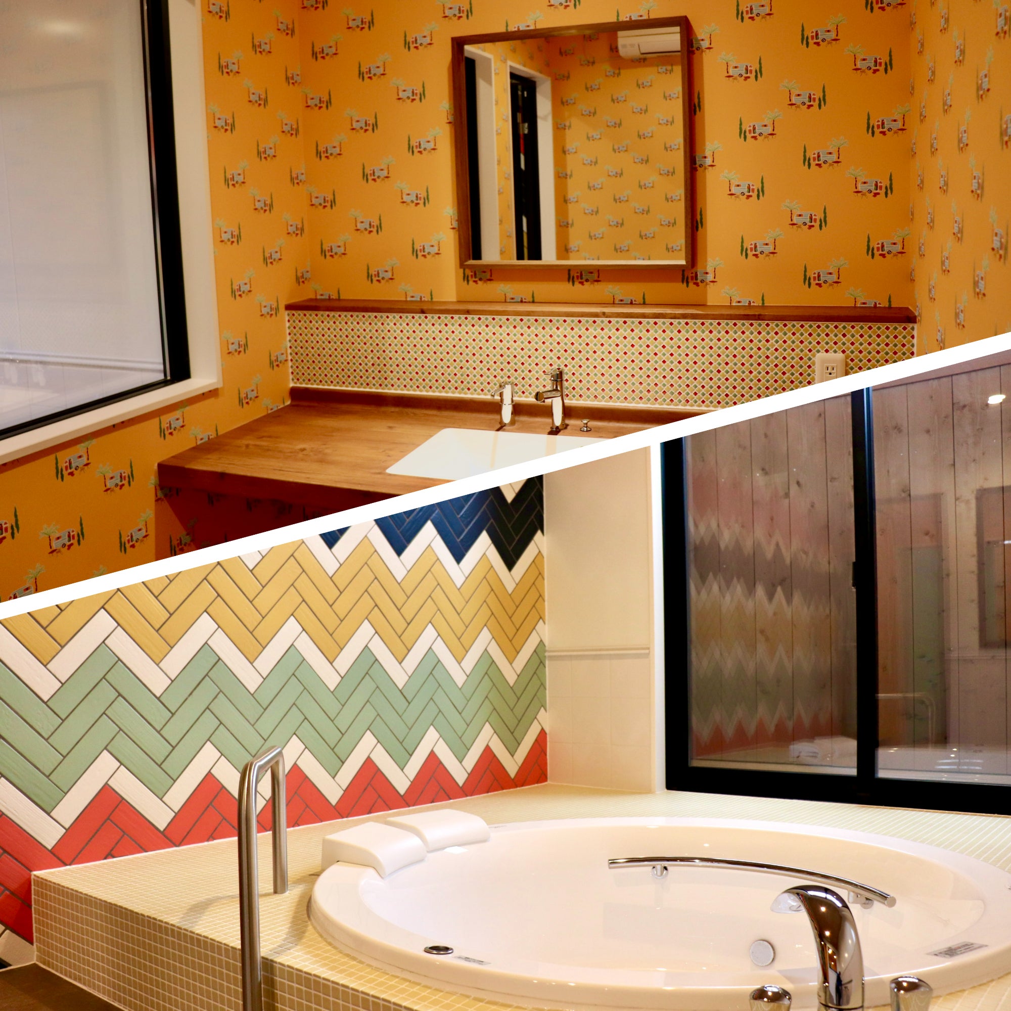 脱衣所・浴室ともにカラフルで
