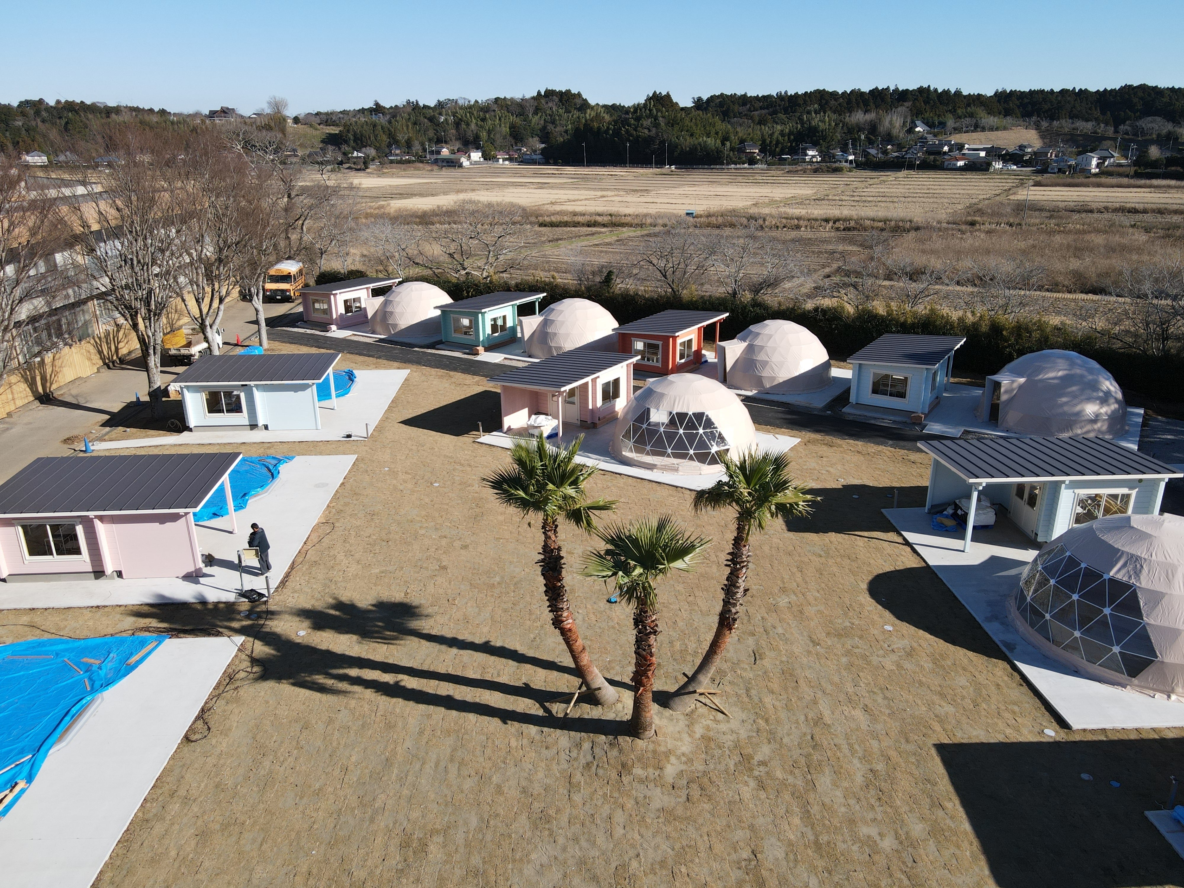 ¡Hola!TACO GLAMP 広報の山本です。オープンまで2か月をきり、グランピングサイトにドームテントが建ちました!やはりテントが建つと「サイトが出来てきたな」と実感しますね。グランピングサイトの全体像をドローン撮影。ドームテントの中はどうなるかというと、、メキシカンテイストになっていきます!カラーパターンは4タイプ!どのパターンもカラフルで可愛くなる予定ですので、楽しみにしていてください。ペットサイトにもドームテントが入りました!次回の更新をお楽しみにしていてくださいね!