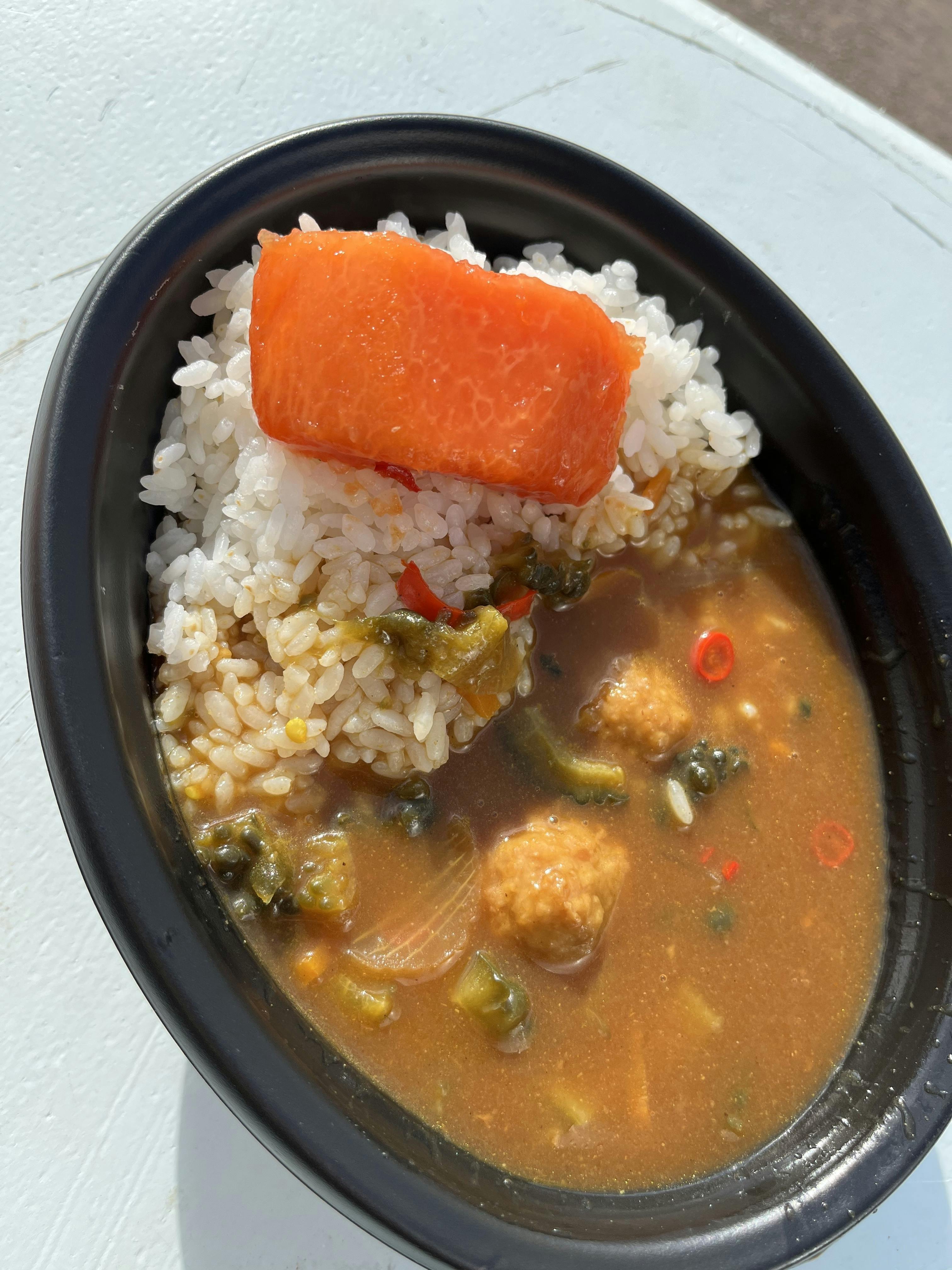おじさんが『カレーにコーレーグス入ってるでしょ!ピリッと刺激がある辛さでとっても美味しいよ』だって。