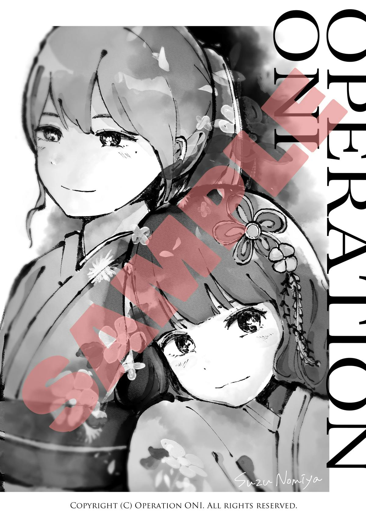 初回は、Operation ONIのキャラクターデザイナー・ノミヤスズさん描き下ろしのデジタルポスターです。右に描かれているのが主人公の満桜(まお)で、左がその親友・おなつです。デジタルポスターのファイル形式はJPGで、サイズは2894x4093になります。右下にはスズさんのサインも入っています。