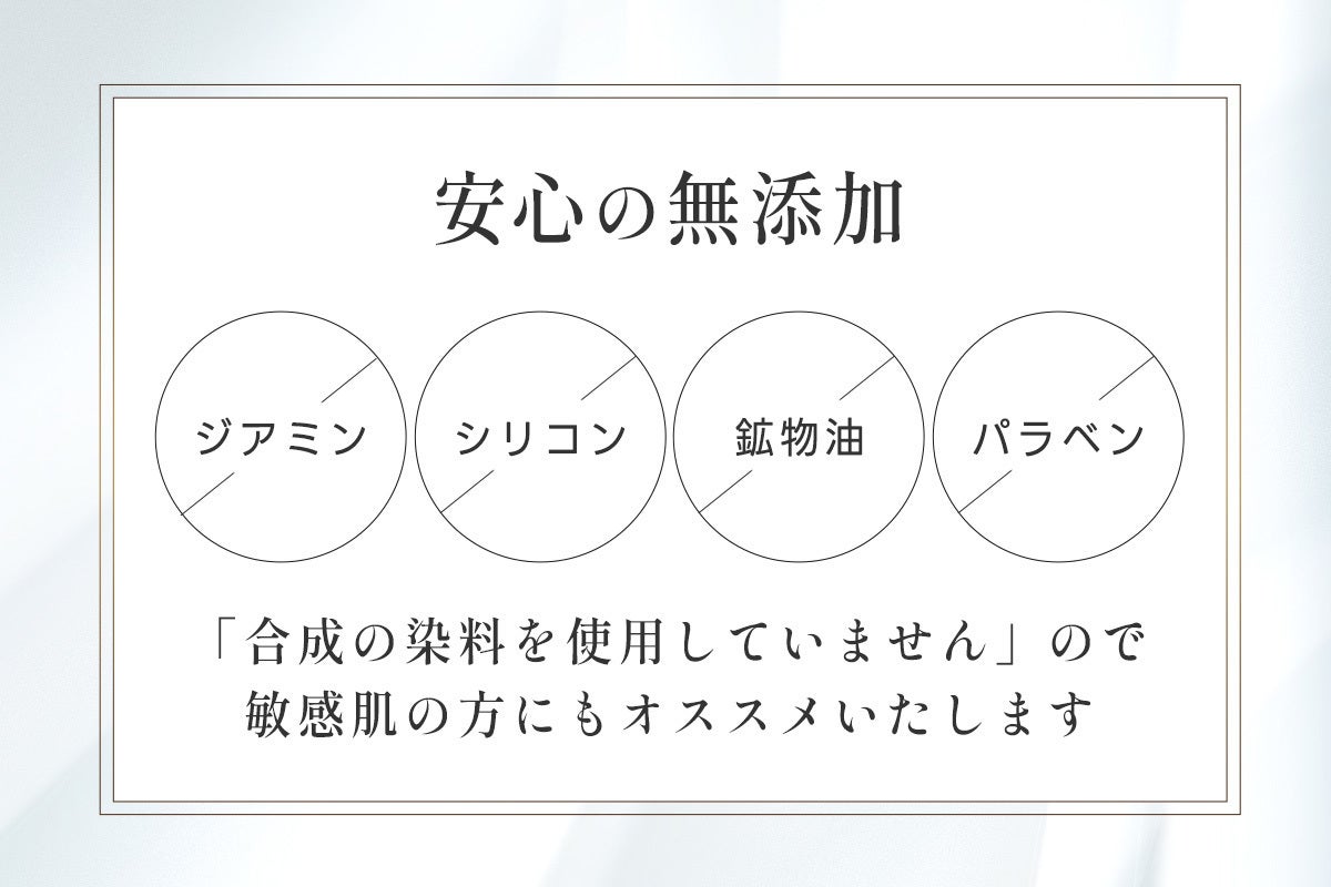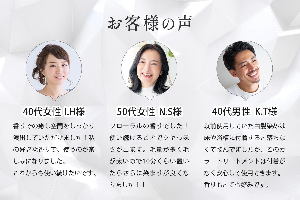 髪と頭皮をいたわりながら髪に潤いを与えます。さらにサラっと感、艶を与えながらナチュラル髪色へ実現いたします。