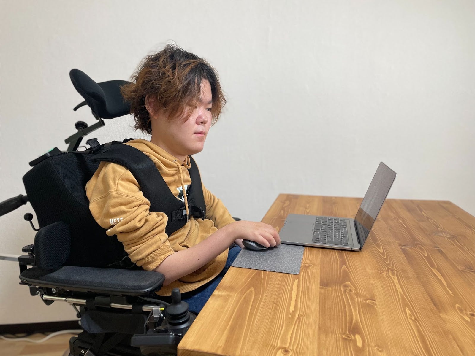 ぼくは脊髄性筋萎縮症という難病があり、生まれつき歩いたことはありません。動かせるのは右手の指先と顔のみです。