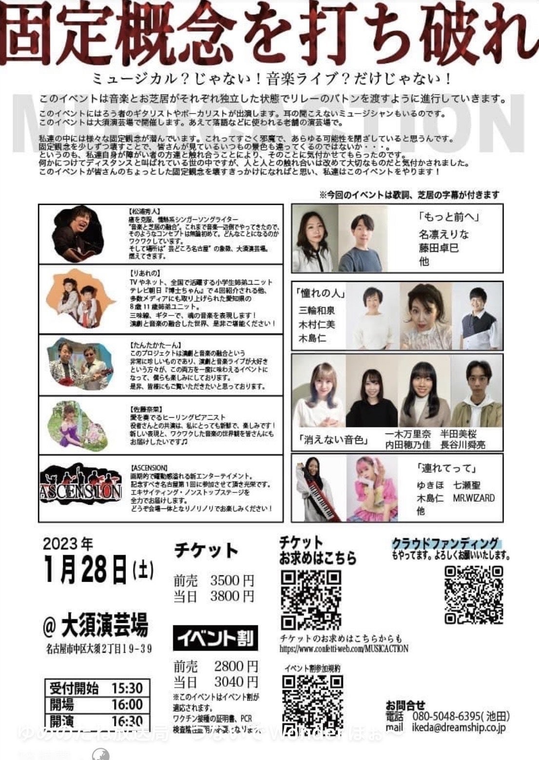 皆様初めまして。上から読んでも下から読んでも名凛えりな(なりえりな)と申します。MUSIC×ACTIONとは何ぞや?ということで、想像されるのはミュージカル系かと思いますが台詞を歌にのせることはありません(笑)アーティストさんも役者さんも、舞台の上で魂をぶつけ合う。そんな感じでございましょうか。みんながそれぞれ主役。そんなステージになると思います。私個人的には、今までの環境とは全く違った環境、メンバーの方々との出会いなど、戸惑うことも最初はありましたが、お稽古を重ねるにつれ、それもわくわくに変化して、素敵な化学反応を体感している最中でございます。今回の出会いに感謝!そしてこの出会いをきっかけにこの先もっと沢山のドキワクやそれを共有できる方々に出会える素敵な予感も!最近特に大切だなと思うこと。それは『言葉にする』ということ。どんなささいなことでも言葉として形にすることで、それはちゃんと存在してびっくりするようなタイミング、大きさになって自分に返ってきたりするんですよね。年末からそんなことが続いているので、思いはちゃんと伝えようと改めて思いました。なのでここまで読んでくださったあなたにも。このイベントを知ってくださって、このページまで足を運んでくださって、私達を見つけてくださってありがとうございます!劇場で、はたまた別の場所でもお会いできるのを楽しみにしておりますネ。LOVE & PEACE
