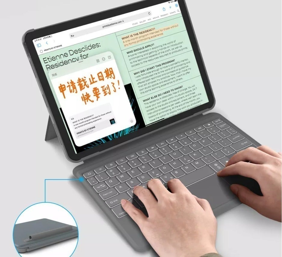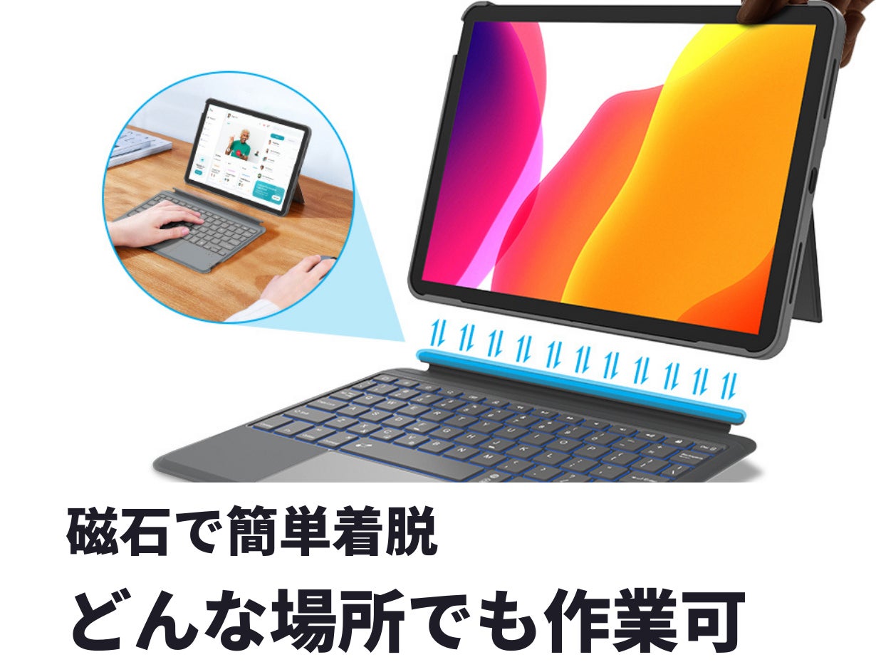 Bluetoothで繋がってますので、ノートパソコンの様に使えるだけでなく、切り離した状態でもキーボードの打ち込みが可能です。これにより、タブレットで書き込みをしたまま、打ち込みも出来る様になりました。ノートの代わりに机の上にタブレットを置いて書き込み、サッと縦に縦て、横にあるキーボードで打ち込める、そんな世界が待っています。