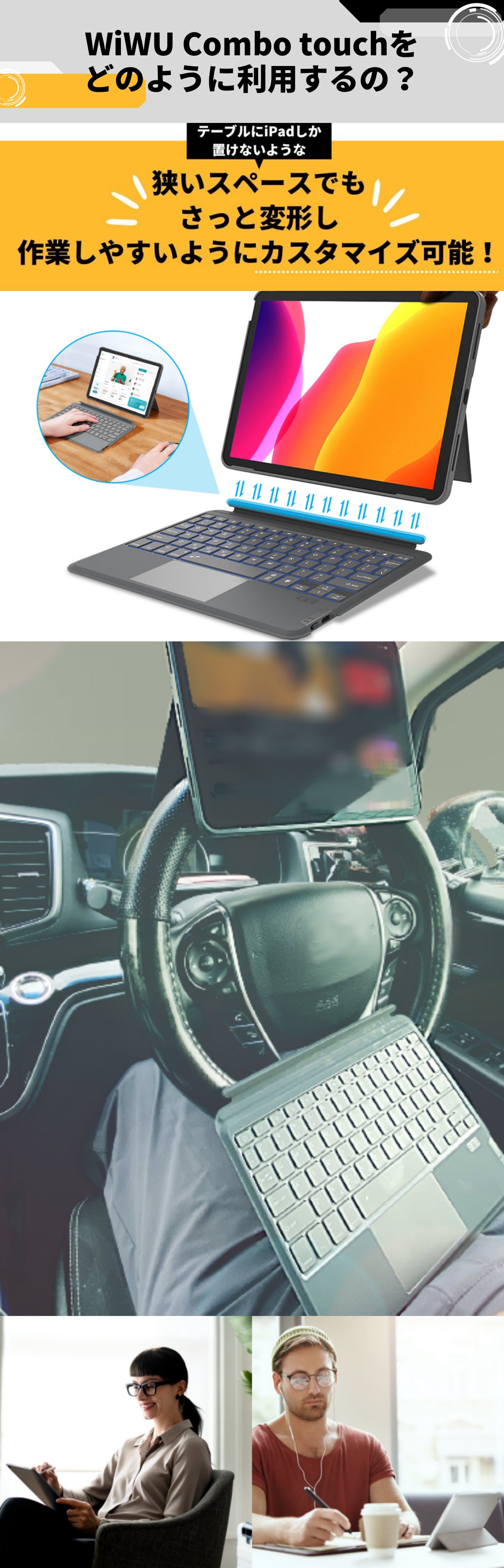 車内やカフェ・ラウンジでもiPad操作が無理なくできるから作業効率UP!