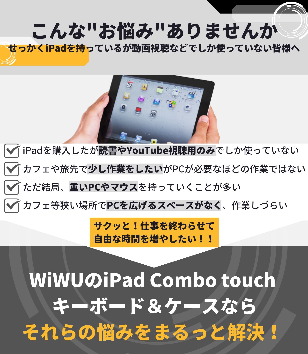 仕事でノートパソコンを持ち歩く人は多い。だが40歳を過ぎるとその重みが辛い。ちょっと待て!iPadが遊んでる、そこで最新型キーボードケースが登場した。詳細は他を参照ください。