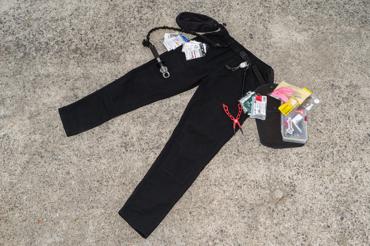 バス釣りに使ってみました。オプションの「KOBANZAME®」(※後述)も併用で、これだけの道具をそれぞれのポケットに分けて収納できました。写真には写っていませんが、後ろポケットに「財布」「スマホ」も入っています。加えてランディングネットも腰にぶら下げていました)