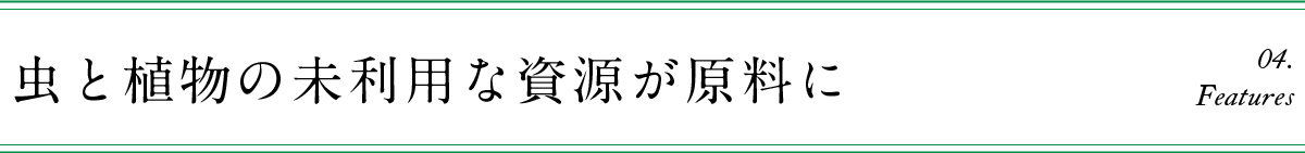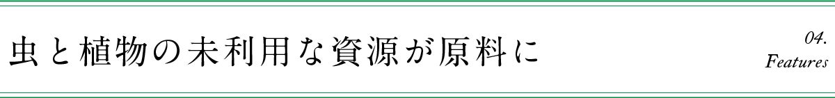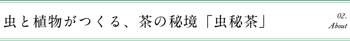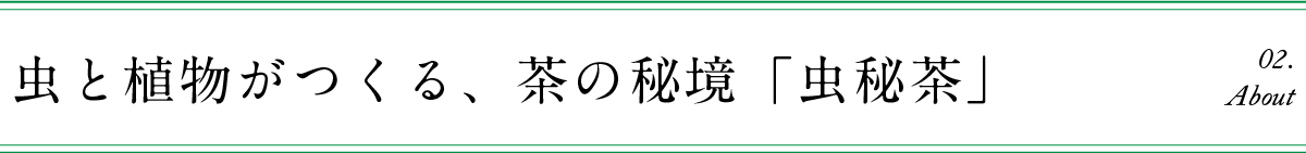 虫秘茶を生態学の言葉で表現すると、植物と昆虫の相互作用の賜物と言えます。植物は昆虫に食べられないよう、渋みや苦みを持ちます。一方で昆虫はそれらを克服して植物を食べられるように進化してきました。この渋みや苦みに代表されるような植物成分が、虫秘茶の風味のもととなります。フレッシュな状態では苦くて到底食べられない植物の葉も、昆虫の体内を通ることで、苦みも渋みも感じないほどに姿を変え、驚くほどに香り高く味わい深くなるのです。