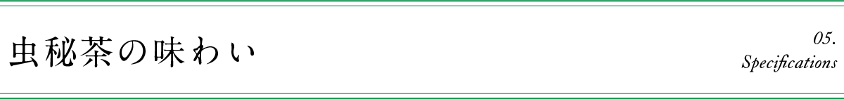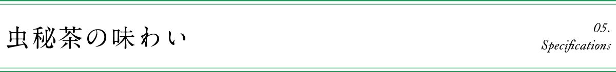 虫秘茶の茶葉2gに対し、200ccのお湯をご準備ください。茶葉に90℃のお湯を注ぎ、30〜40秒ほどお待ちください。沸騰したてのお湯ですと、雑味が出てしまいますので少し冷まします。しっかりと色が出ましたら温かいうちにどうぞ。サクラは特に温かいうちがおすすめです。また、2煎目以降も味や香りの変化を楽しんでいただけます。