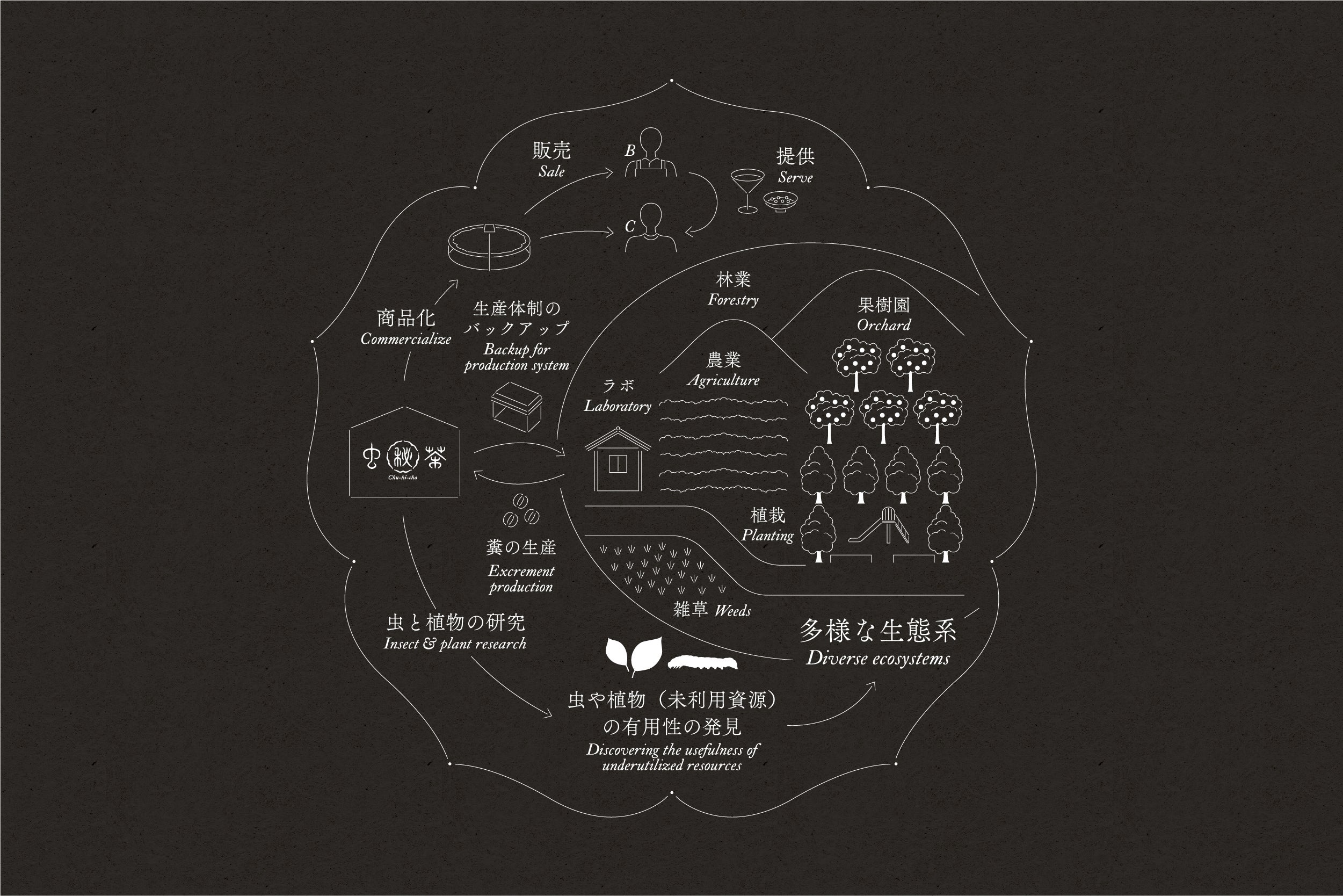 虫秘茶は「多様な植物」と「多様な昆虫」の掛け合わせで生み出されます。一説には地球上に植物は27万種、昆虫は蛾の仲間だけで16万種いると言われており、これらの多様性を資源として捉えたとき、ほとんどが「未利用な資源」です。特に、多様で独創的な機能を持つ昆虫は未開の宝庫と言えます。そんな、人類が見過ごしてきた自然には驚くような魅力や機能が秘められているはずです。虫秘茶には、そうした自然のポテンシャルを掘り起こす力があります。時には雑草とされる植物や、厄介者と呼ばれる蛾の幼虫の掛け合わせからも、驚くほどに味わい深い虫秘茶が生まれます。そんな嫌われ、疎まれてきた生き物たちにもスポットを当て、魅力を引き出すことができるのが虫秘茶の面白さであり醍醐味です。昆虫や植物の多様性を虫秘茶として表現することで自然の新たな活用を模索し、それがまわりまわって人間社会の持続・発展に繋がると信じています。