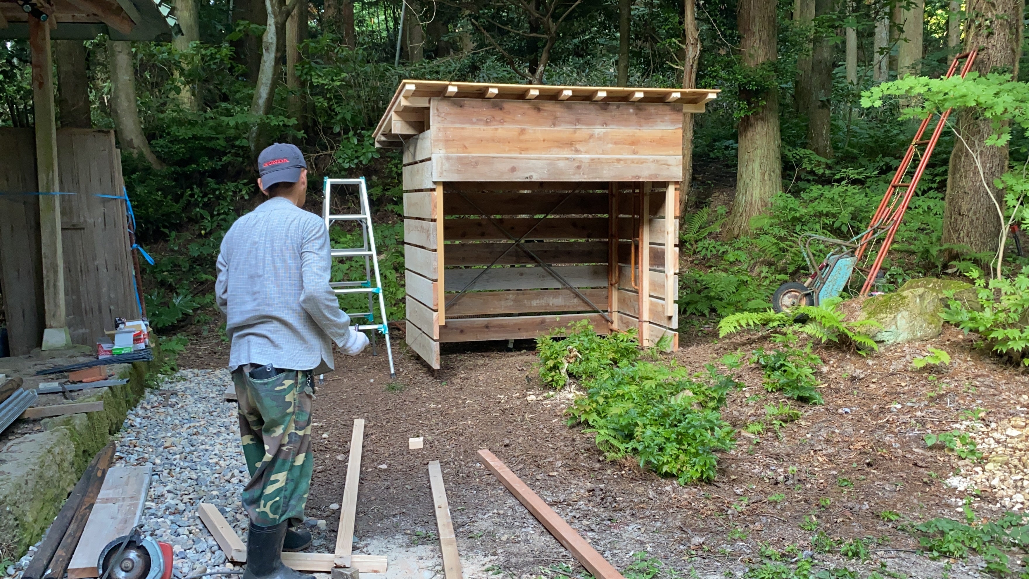 げんじぃの家の中の工事、片付けなどがほぼ終わりげんじぃの家のコンセプトであるヤギと過ごせる家のメインでもあるヤギ小屋を作り始めました。作業はDIYで材料は廃材のビテ足場、型枠板などを使い作ったので見た目の限界はありますが1日目はこんな感じ黙々と作業を進めていた時には気付きませんでしたが離れて見てみて昔のバス停??そんな風に見えてしまいました笑そして作業2日目屋根は使えず余っていた立平ロックを葺きました。波トタンにしようと思っていたのですが波トタンから比べるとかなりの高級屋根材での仕上げとなりました(^^)vそして雨樋もつけて雨の日もしずくが室内に入らないようにバッチリ対策です♪柵に使う支柱は廃材のアングルを切って杭にしましたがこれが地面に入って行かない…そしてなんとか入ってもまっすぐに打ち込みがなかなかできず回転していくしと往生しました^_^;支柱だけでも打ち込む予定でしたが大ハンマーの柄が折れてしまい…この日の作業は強制終了となりました…げんじぃとげんじぃのお姉さんと、おっかぁと昔を思い出しながらまずは泊まってもらう予定です。泊まる予定日までもう少し間に合わせるように頑張ります(^^)v※クラウドファンディングでのご支援いただいた皆様への宿泊に関しては肝心のヤギとの触れ合いが口蹄疫の関係で中止になったままなので、解除する見通しが出来たら予約を開始したいと思います。なお、ヤギとの触れ合いがメインではなく、ヤギのお世話にこられる方に関しては指定の事前調査をさせていただき牧場への立ち入りOKとなった場合に関しては使用をしていただこうと思っています。8月15日行こうとなる見込みです。ご支援をいただきました皆様には大変ご迷惑をお掛けし申し訳ありませんがご理解をいただければと思います。※カードには使用期限が記載されていますが、遅れた分は延長させていただけますのでご安心ください。