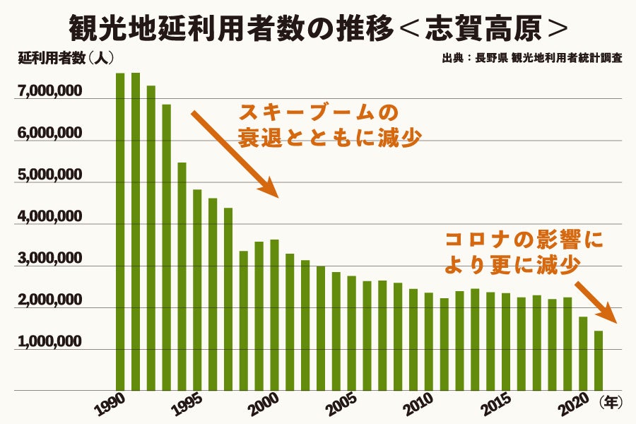映画『私をスキーに連れてって』のヒットやバブル景気の影響で、1980年代〜90年代には空前のスキーブームが到来。ここ志賀高原にも、最盛期には年間700万人以上の方々が全国各地から訪れていました。しかし、ブームの衰退とともに観光客も減少。2019年には志賀高原の利用者は220万人程度まで落ち込みました。