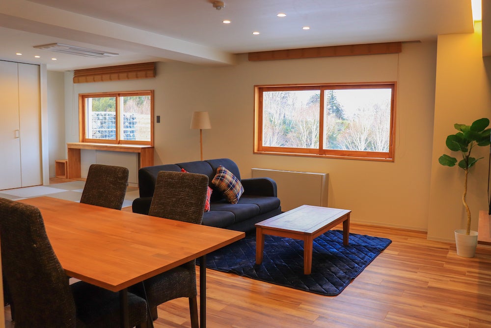 客室部分は一足早く完成を迎えています。2〜4名様部屋を2部屋、4〜6名様部屋を3部屋、計5部屋をご用意。いずれもコンドミニアムタイプのお部屋となっており、リビング・寝室・トイレ・お風呂・キッチンからなるご自宅のように過ごせる広々とした空間となっています。たたみのある和洋室タイプで、ベッドから転倒の恐れのある小さなお子様でも安心してお泊りいただけるようにいたしました。