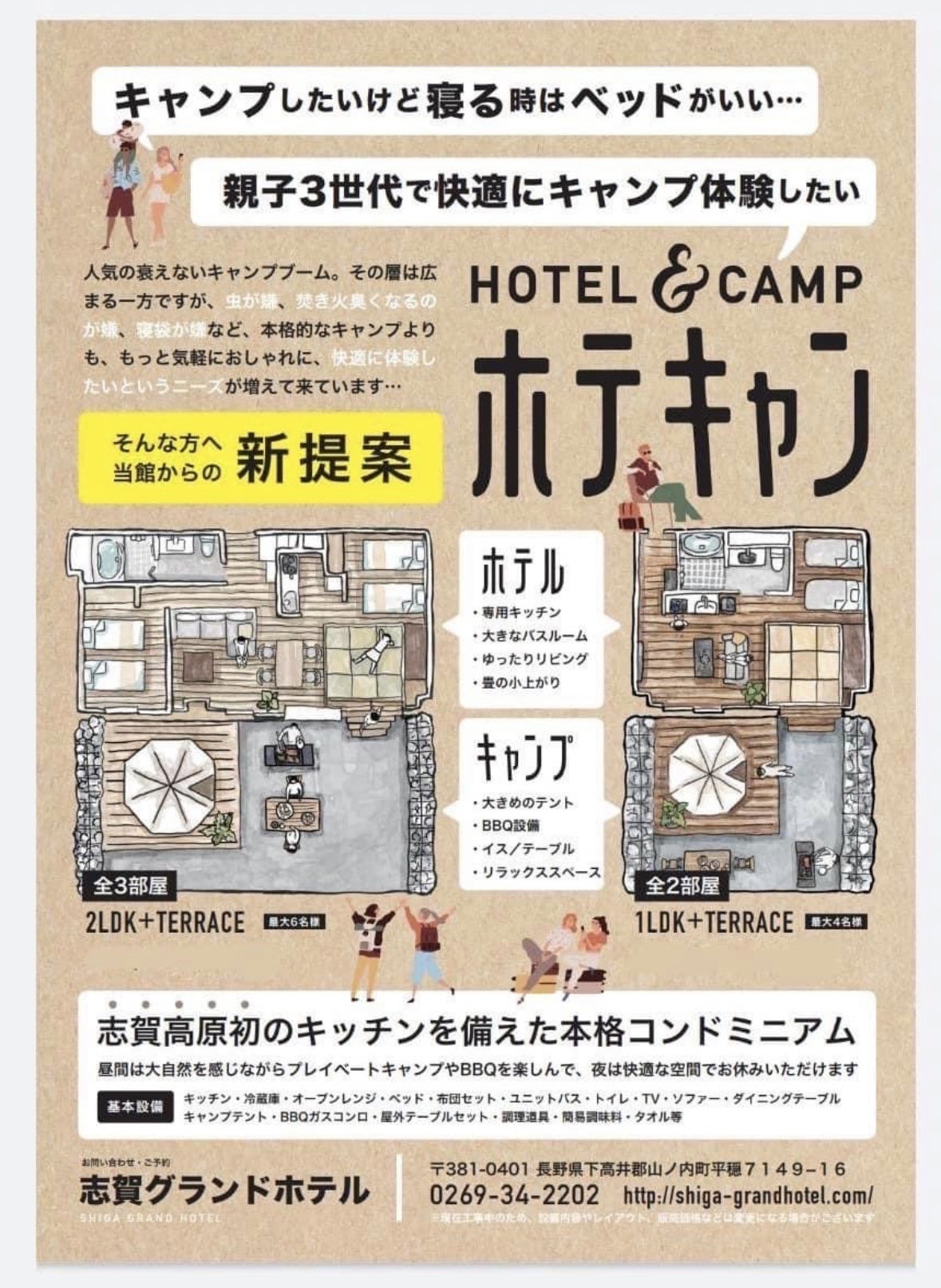 その名の通り、ホテルとキャンプ、その両方を満喫できる自然環境と設備を実現したのが、志賀高原にある当館独自の『ホテキャン』です。小さなお子様のいるファミリーをはじめ、カップルやご友人のグループなど、幅広いシーンに適したストレスフリーなアウトドア環境をご提案します。