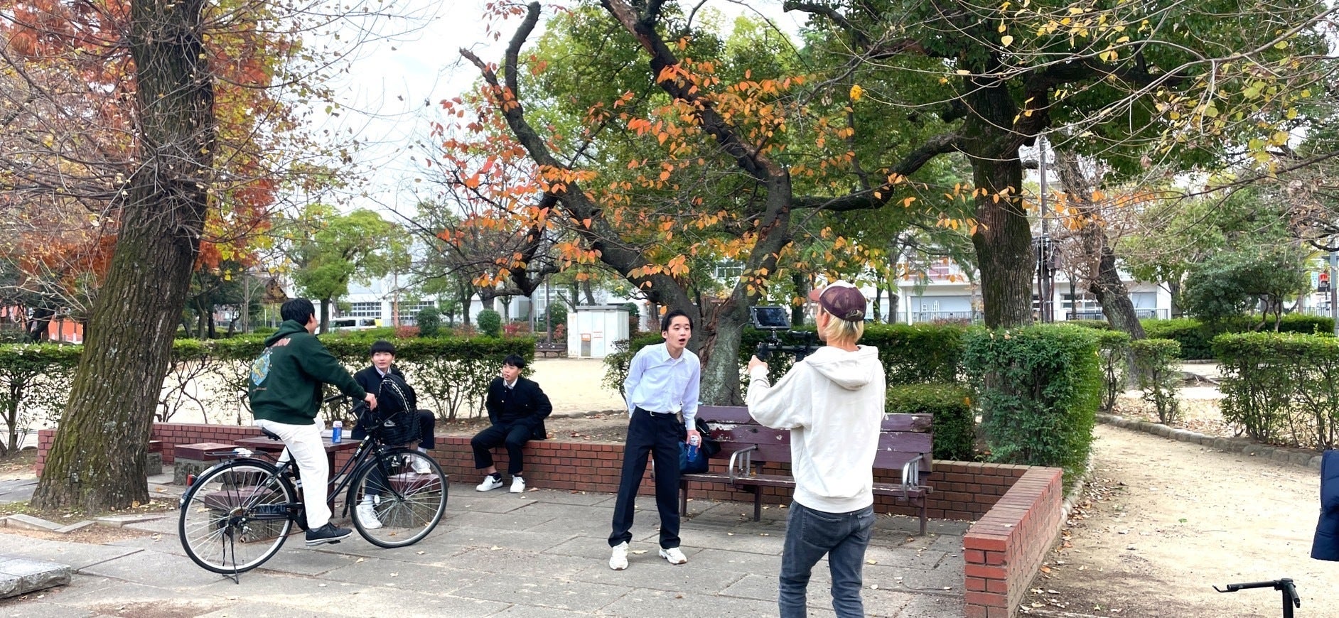 制服を着て、友人3人にエキストラで出演していただき、撮影を行いました。