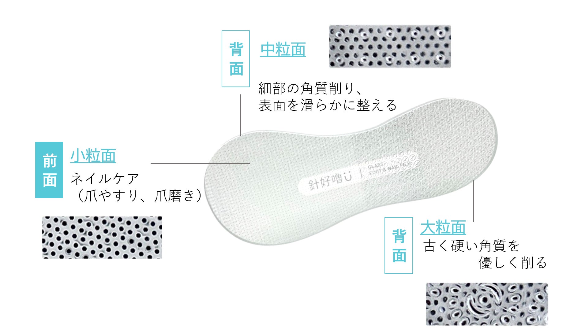 大粒子の面で硬くて厚い層を削り、中粒子の面で表面を整えれば、濡らさずあっという間につるすべかかとに生まれ変わります★