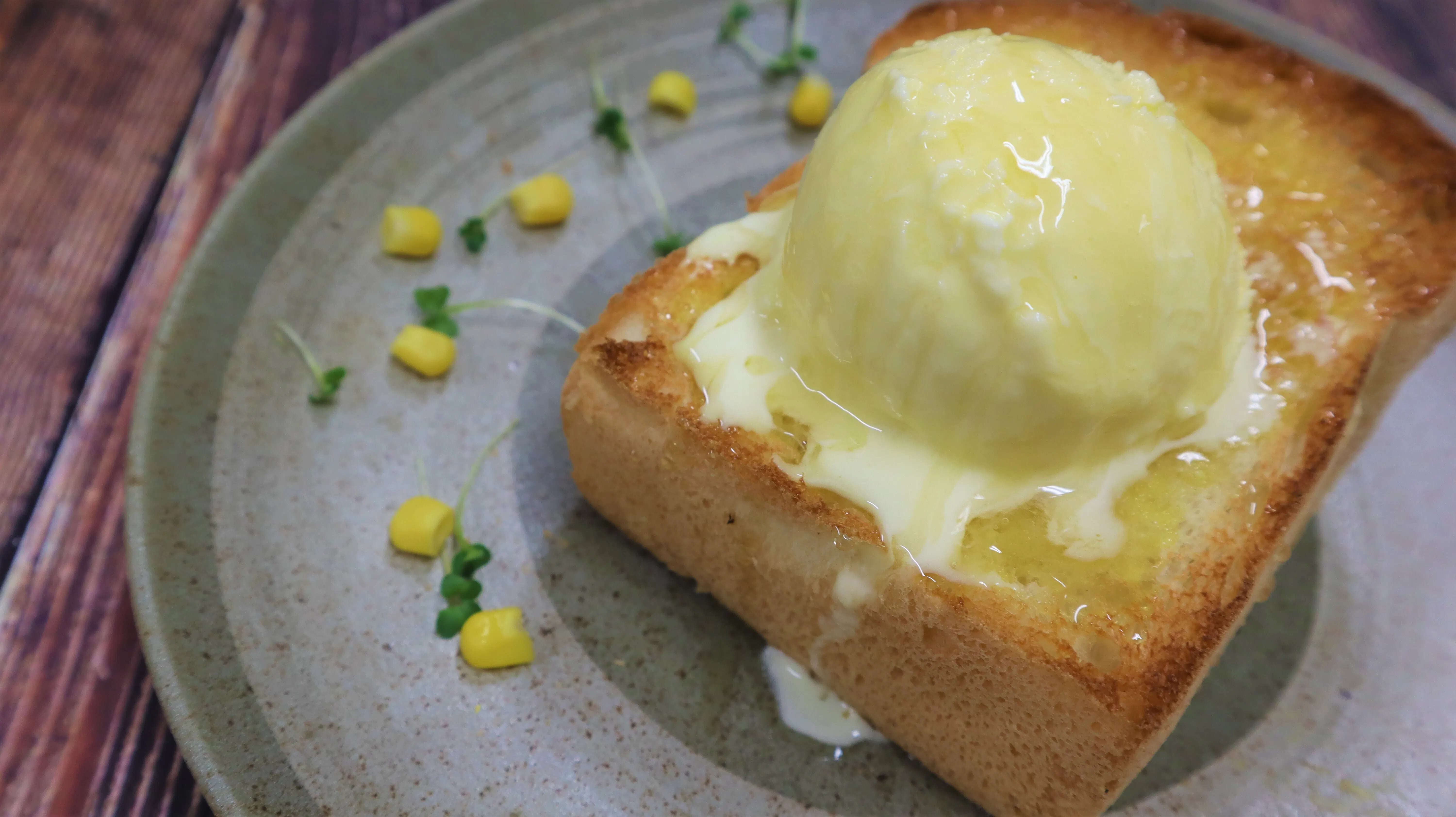 このままでお召し上がりいただくのはもちろんですが、トーストにバターを塗ってジェラートを乗せ、最後にはちみつをかけてお召し上がりいただくと、とうもろこしジェラートのハニートーストになります!