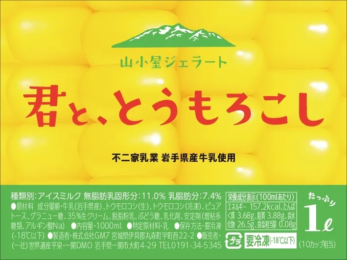 原材料名:成分量順・牛乳(岩手県産)、とうもろこし(生)、とうもろこし(冷凍)、ピュアトース、グラニュー糖、35%生クリーム、脱脂粉乳、ぶどう糖、乳化剤、安定剤(増粘多糖類、アルギン酸Na)