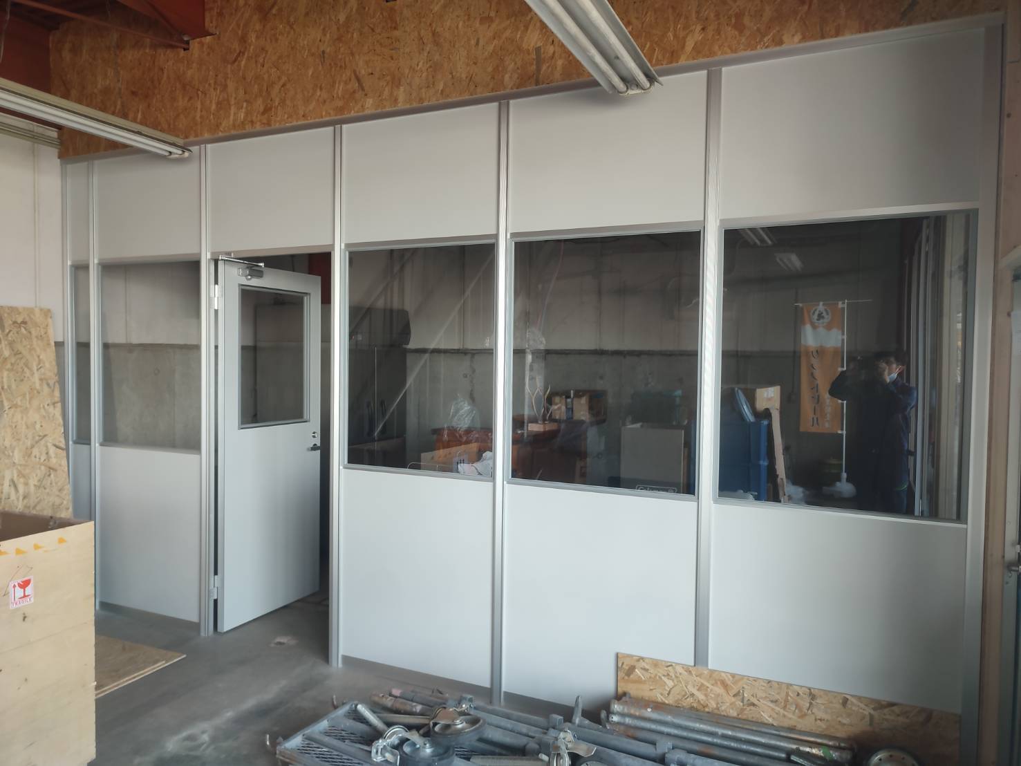 販売所と製造場の間仕切りのパーティション大きくとったガラス窓は、販売所にいらしたお客様から、製造場の中がよく見渡せる造りになっています。販売所と製造場を一体感のある造りにしています。製造中の作業風景を販売所から見ることもできます。