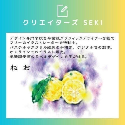 リーターン品の一部にある、クリエイターズSEKI(6名)によるラベルデザインのお一人。ご紹介するのはこちらの方。ねおさま関市出身のフリーのイラストレーター。美濃関麦酒の「上之保ゆずエール」「関Pilsner-MAGOROKU-」「焔-HOMURA-」「空と麦と風と」などのラベルは同氏によるもの。どんなラベルデザインが上がって来るのか、楽しみです!